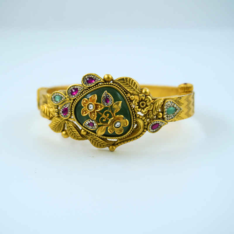 November 19, 2025This vintage-inspired bangle features intricate meenakari work with floral motifs, highlighted by ruby-green stones for a royal finish. Perfect for festive wear, it adds a luxurious and elegant traditional charm to any ensemble.