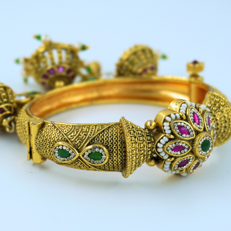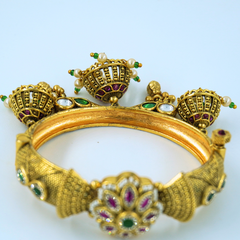 November 19, 2025This exquisite bracelet showcases a floral kundan motif accented with ruby and emerald stones, complemented by ornate temple-style dome charms. Its regal craftsmanship and rich antique finish make it a stunning choice for festive and traditional occasions.