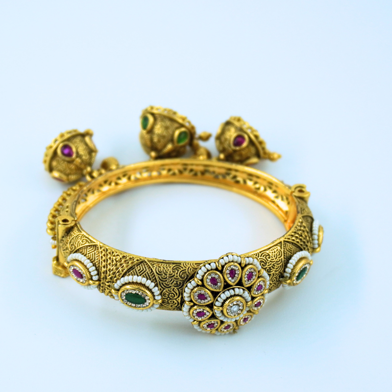 LALEEZ Fashion Jewellery | Antique Gold-Plated Temple Ghungroo Kundan Peacock Motif Bracelet | Ideal for Women – 107