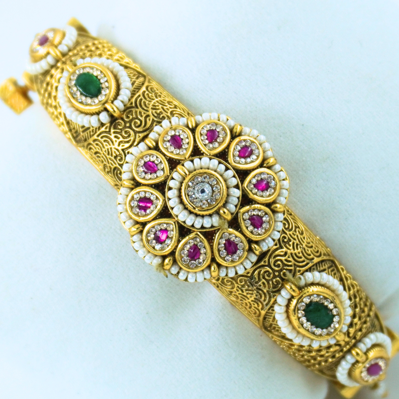 November 19, 2025This beautifully crafted bracelet features a stunning floral kundan centerpiece surrounded by ruby and pearl accents, giving it a regal and festive charm. With its intricate detailing and luxurious finish, it enhances any ethnic or ceremonial look effortlessly.