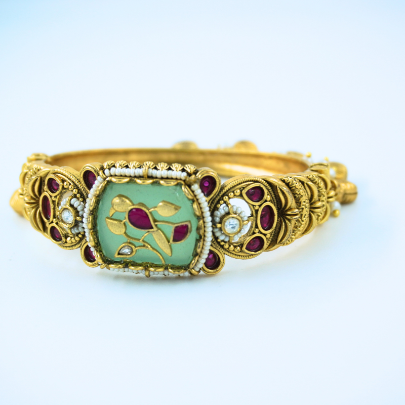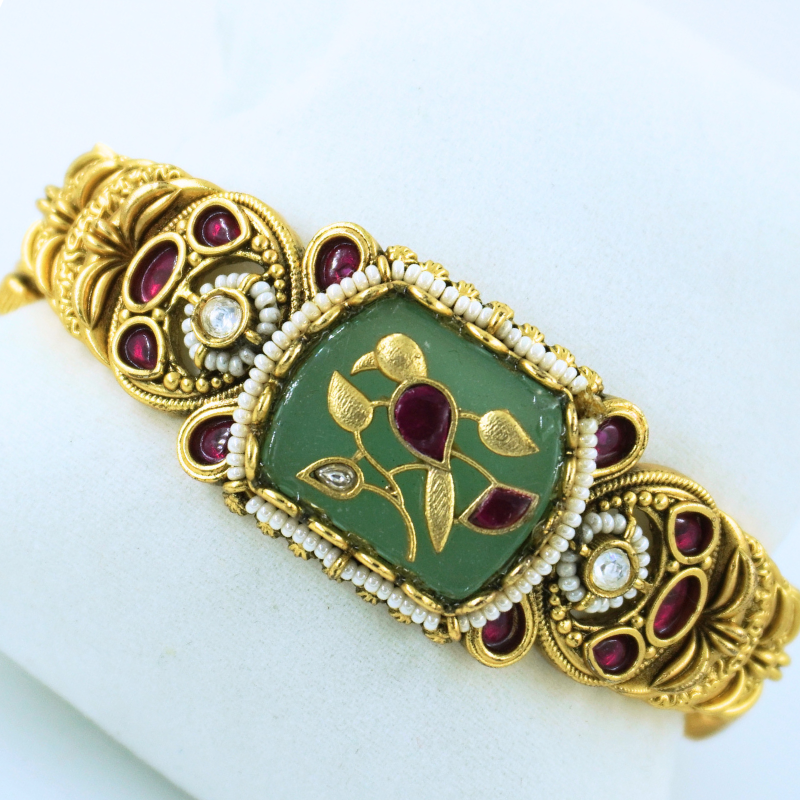 LALEEZ Fashion Jewellery | Antique Gold-Plated Ruby-Studded Carved Emerald Frame Heritage Bracelet | Ideal for Women – 108
