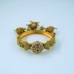 ₹1,875.00This ornate temple-style bracelet features a ruby-centered motif surrounded by kundan work, accented with emerald enamel and delicate hanging charms. Its rich craftsmanship and antique gold […]