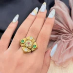 This gorgeous gold-plated statement ring features a round floral kundan design embellished with sparkling multicolor stones for a rich traditional look. Ideal for weddings, festive occasions, […]