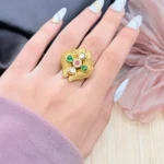 LALEEZ Fashion Jewellery | Gold-Plated Royal Floral Square Statement Ring with Green & White Stone Detailing | Elegant Party Wear for Women – 115