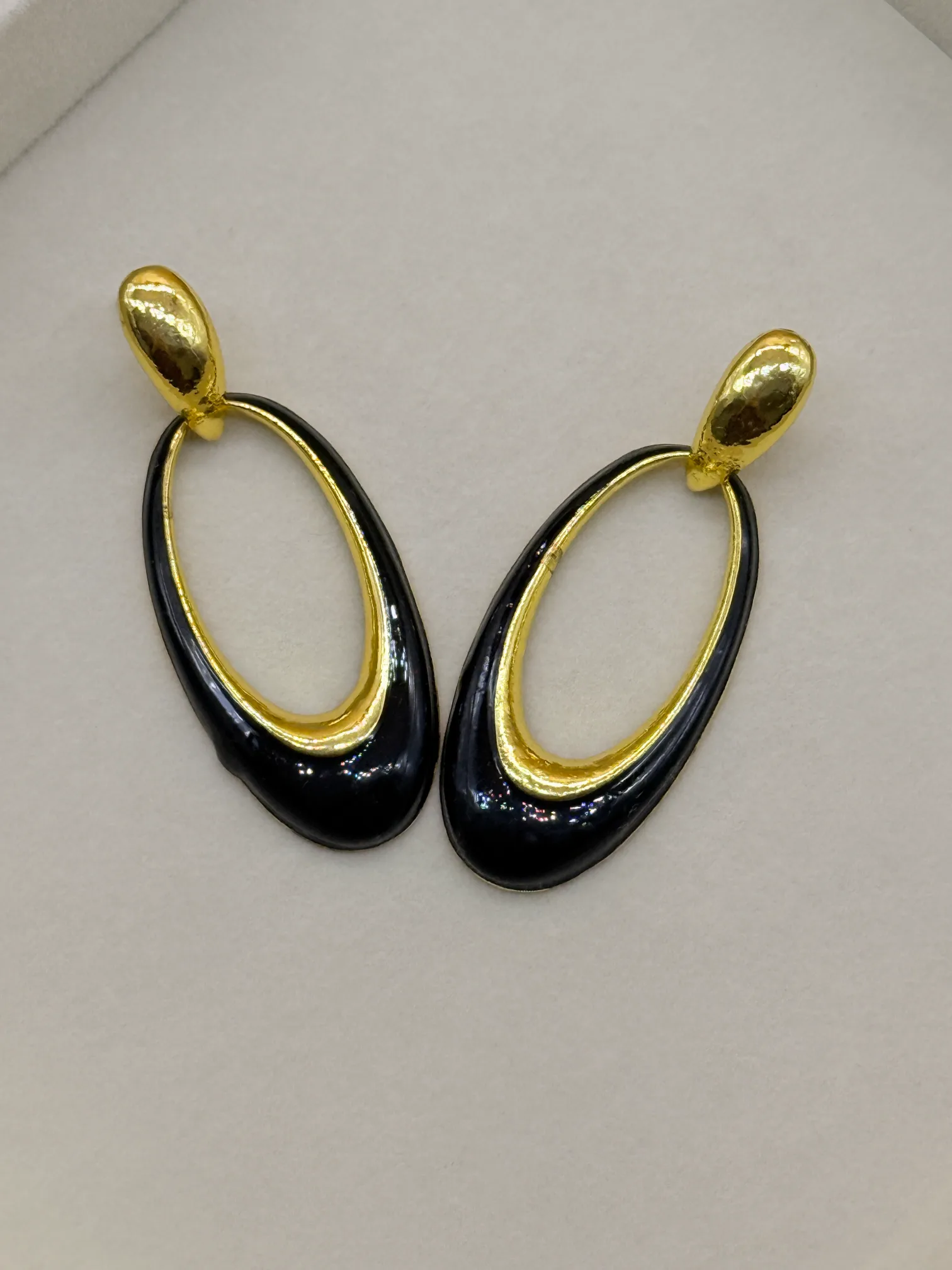 February 19, 2026Make a bold yet elegant statement with these oval drop earrings featuring a sleek black enamel finish beautifully paired with a radiant gold-plated frame. Designed to enhance both modern and classic looks, these earrings are perfect for adding sophistication to everyday wear or special occasions.