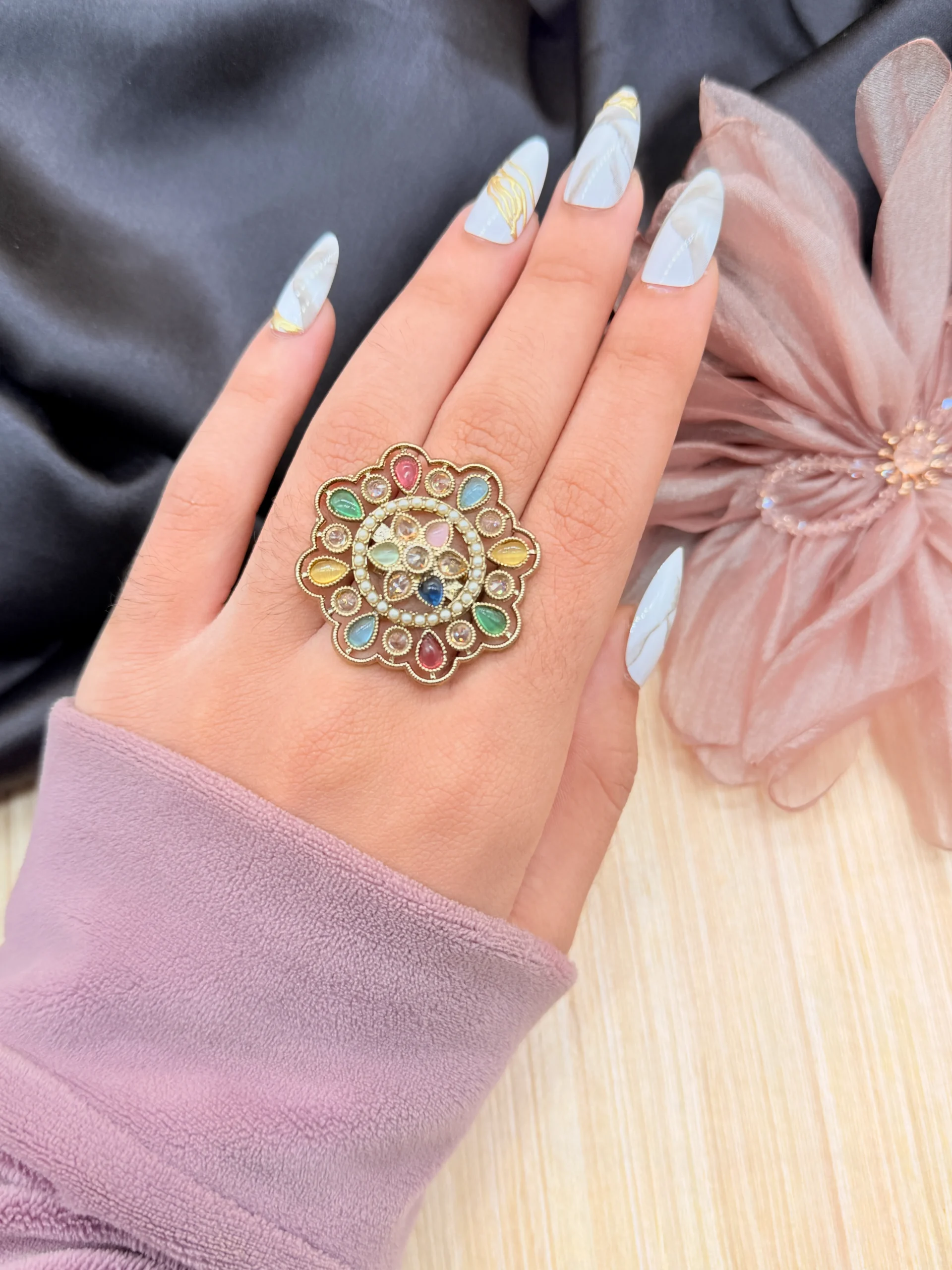LALEEZ Fashion Jewellery | Gold-Plated Multicolor Gemstone Floral Kundan Statement Ring | Perfect for Women – 106