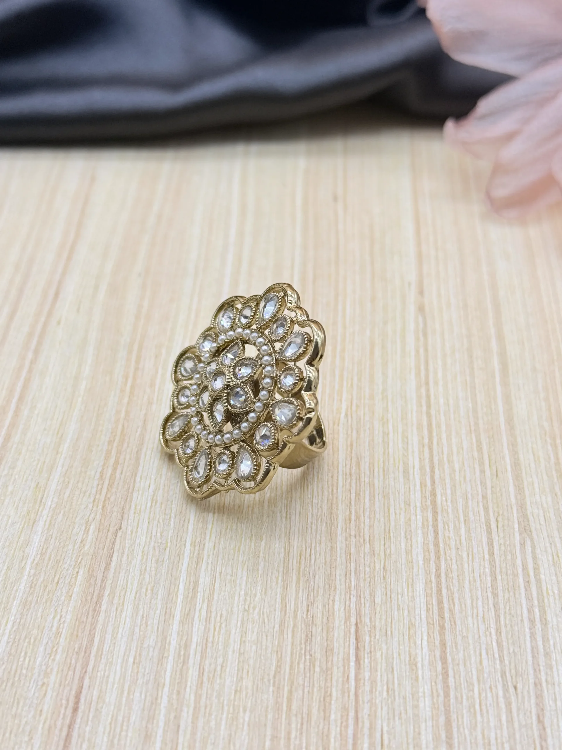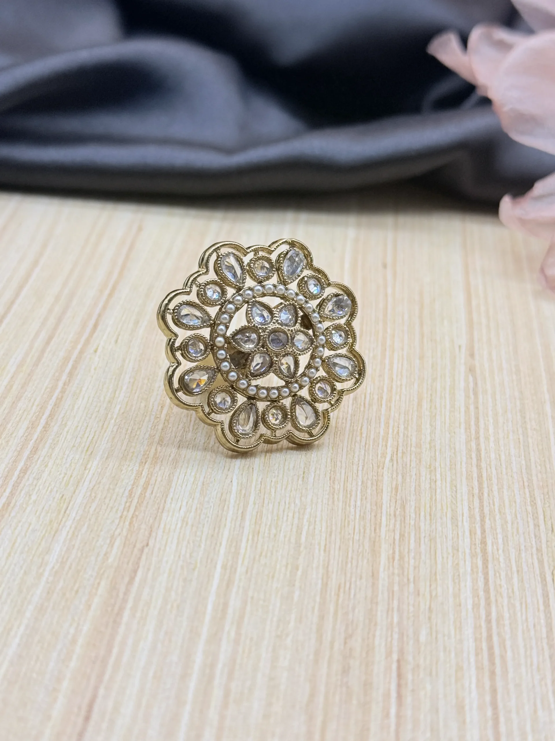 LALEEZ Fashion Jewellery | Gold-Plated Antique Pearl Floral Filigree Statement Ring | Elegant for Women – 109