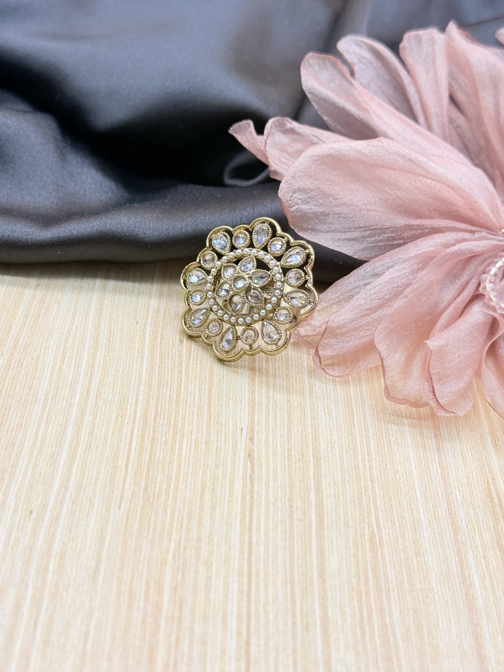 This beautiful floral statement ring features a timeless kundan-inspired design with sparkling crystal petals set in a rich gold-plated finish. Perfect for weddings, festive occasions, and traditional outfits, it adds an elegant and graceful charm to your jewellery collection.