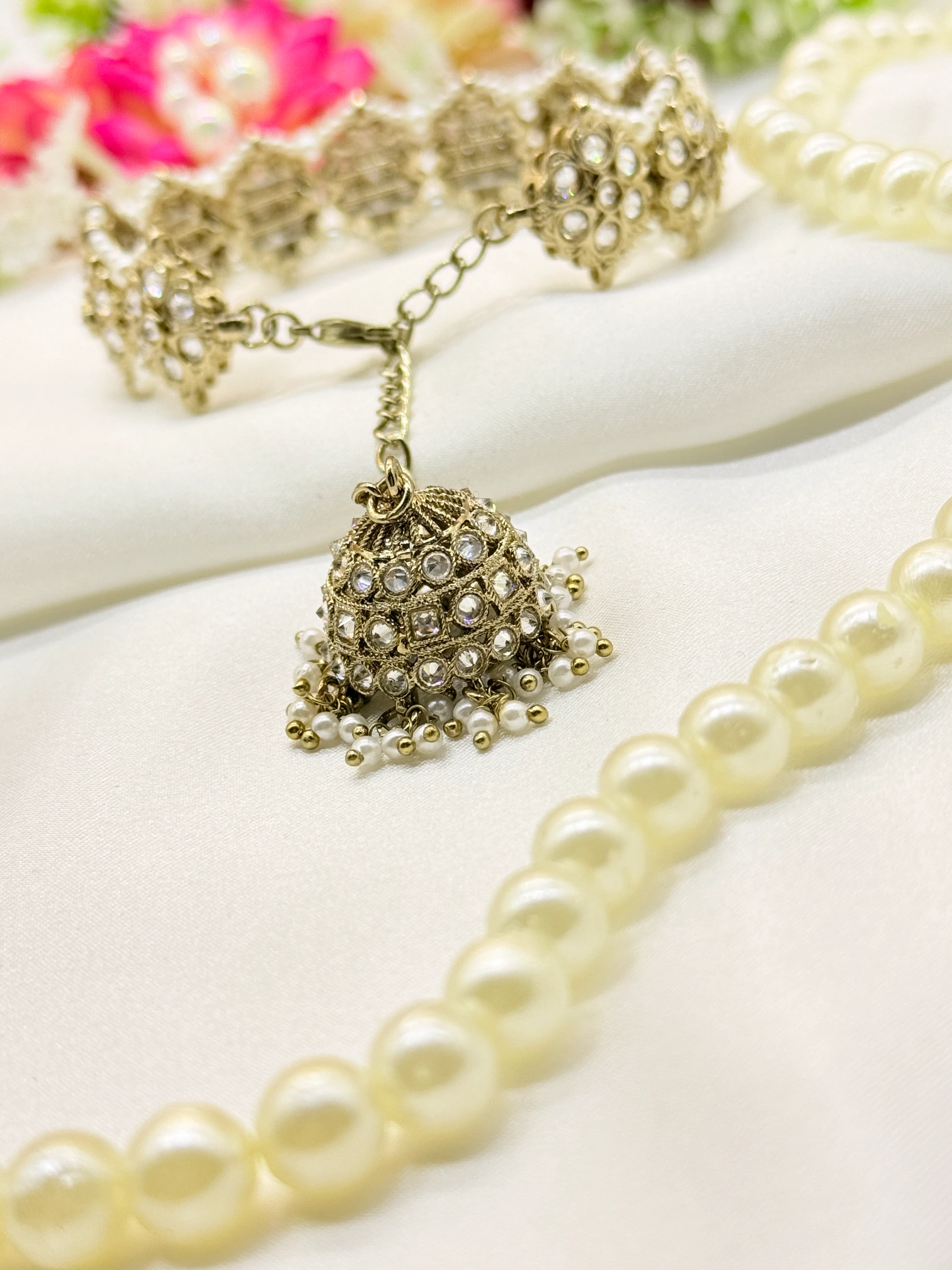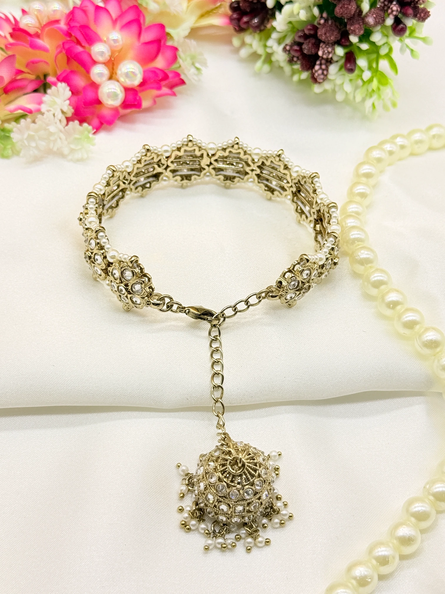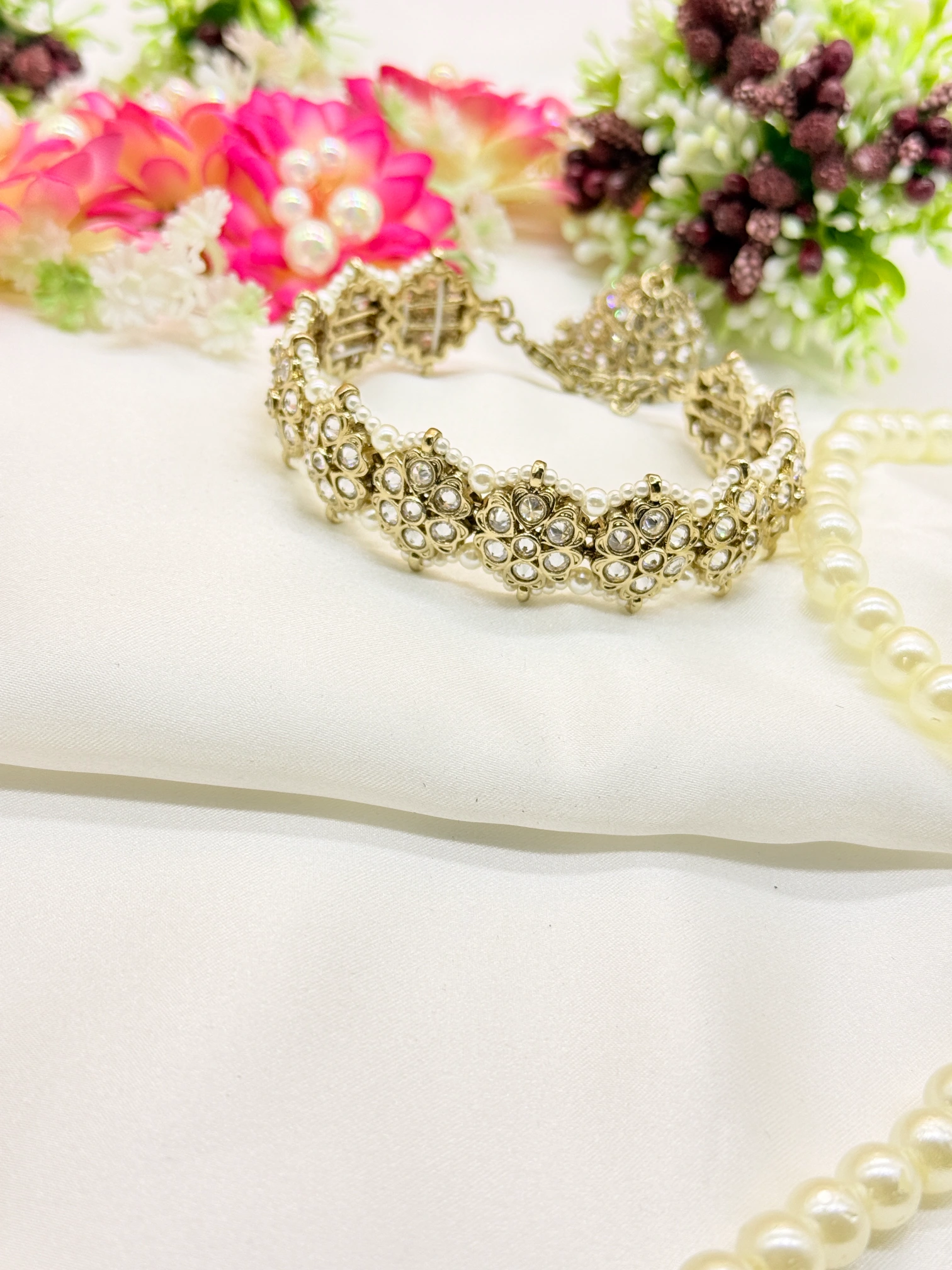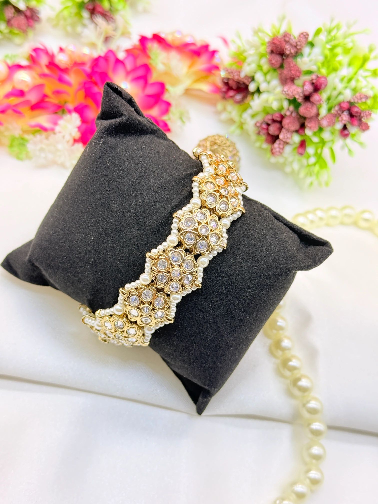 March 18, 2026This exquisite gold-plated cuff bracelet features beautifully arranged floral clusters studded with shimmering crystals and bordered with delicate pearl accents. Its rich and intricate design offers a graceful traditional appeal, making it a perfect choice for weddings and festive occasions.