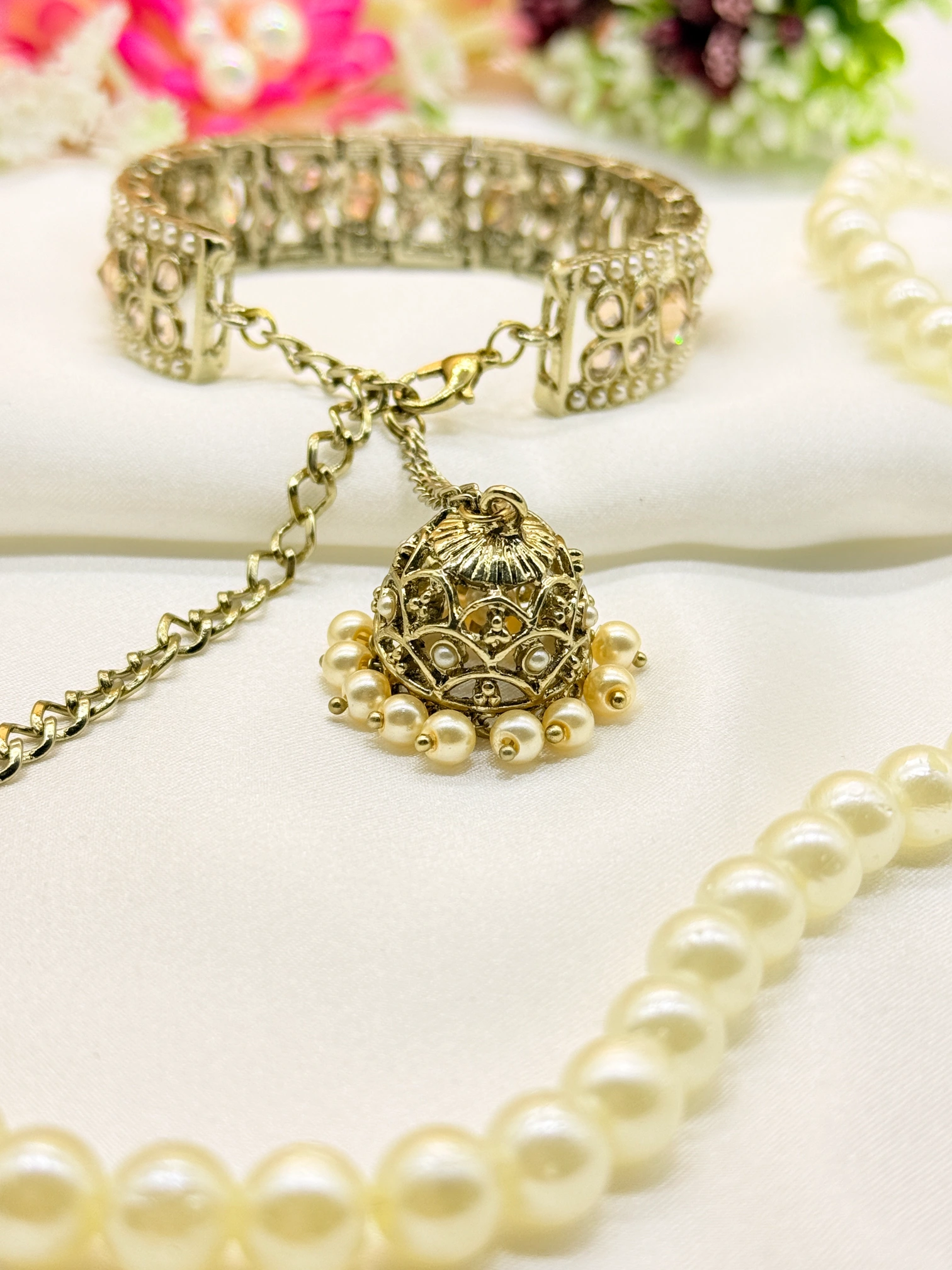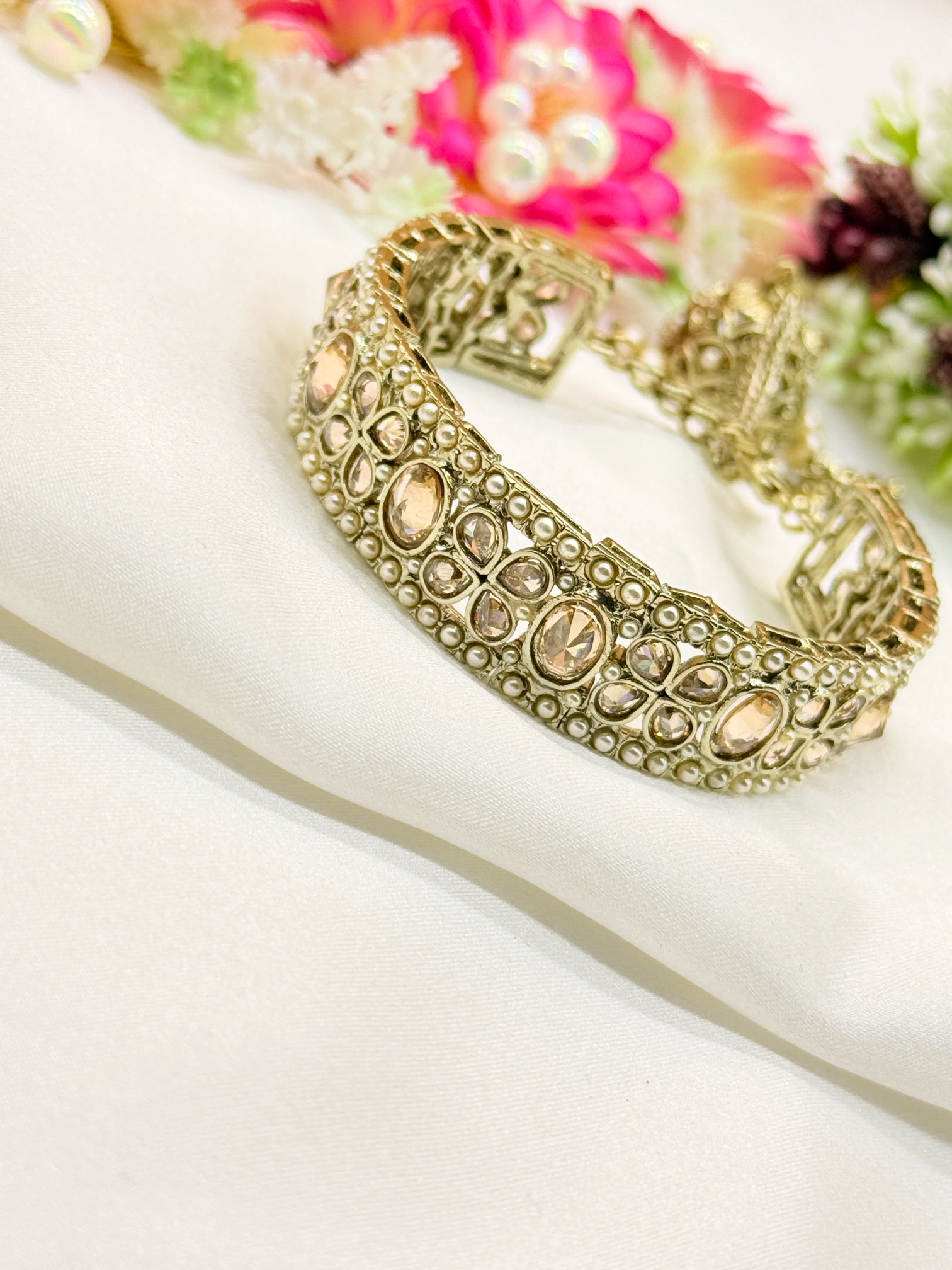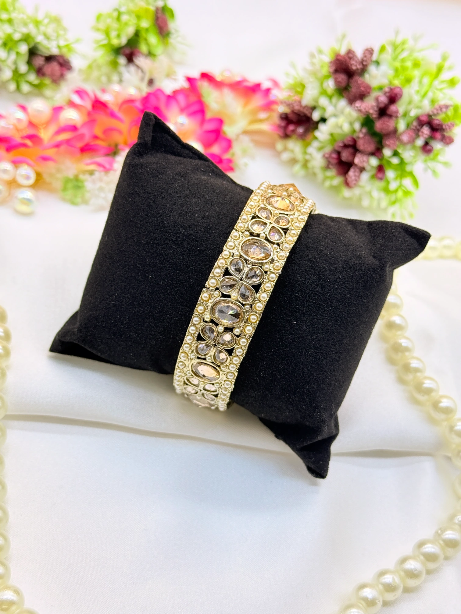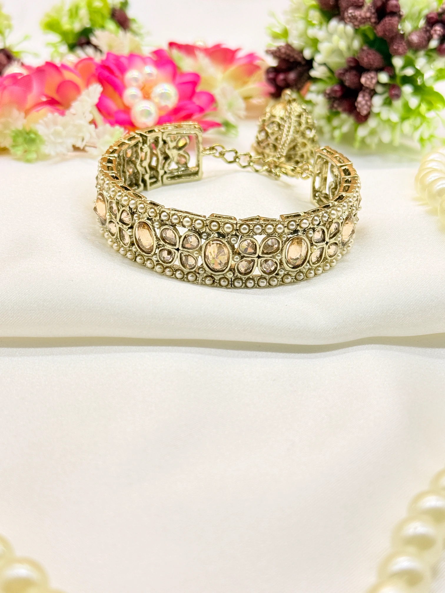 March 18, 2026This beautifully crafted gold-plated cuff bracelet showcases a delicate floral pattern adorned with sparkling crystals and fine pearl accents. Its intricate and graceful design adds a feminine charm, making it a perfect accessory for festive wear and special occasions.
