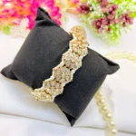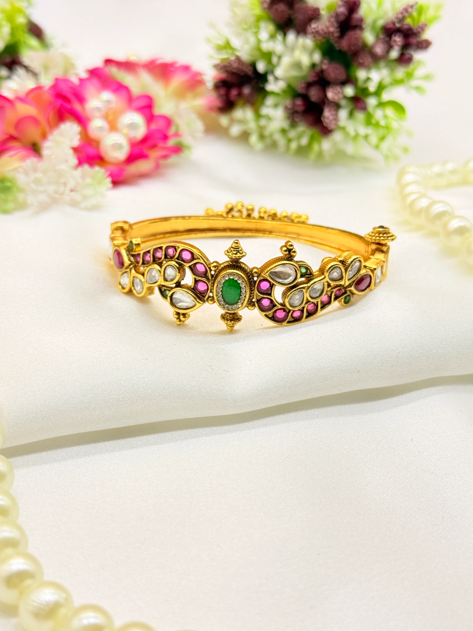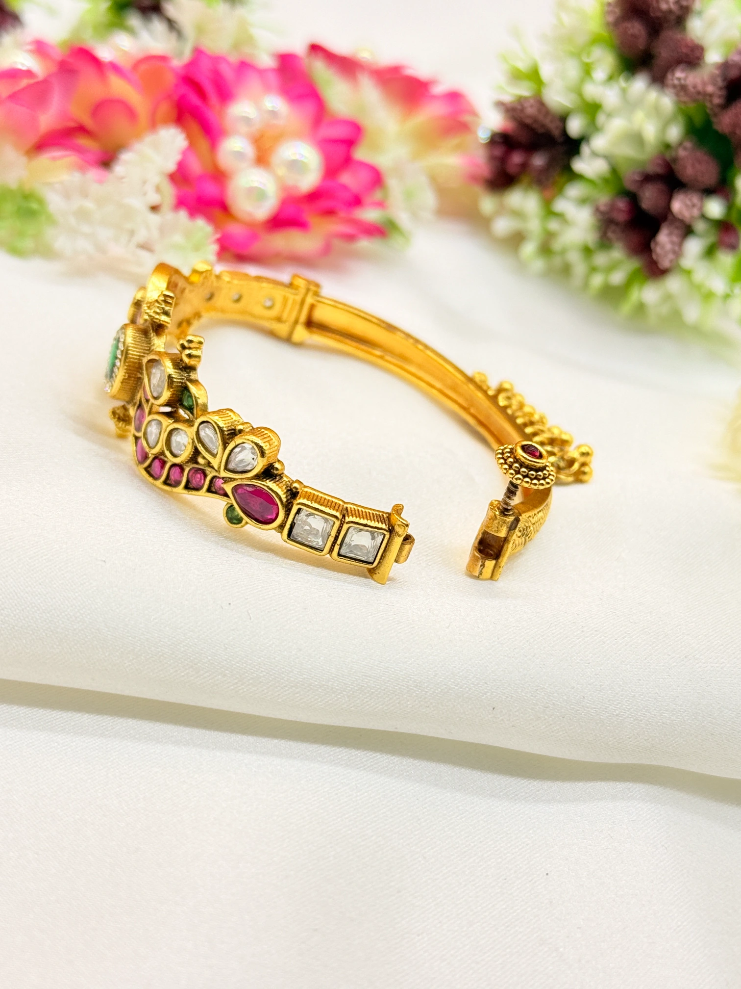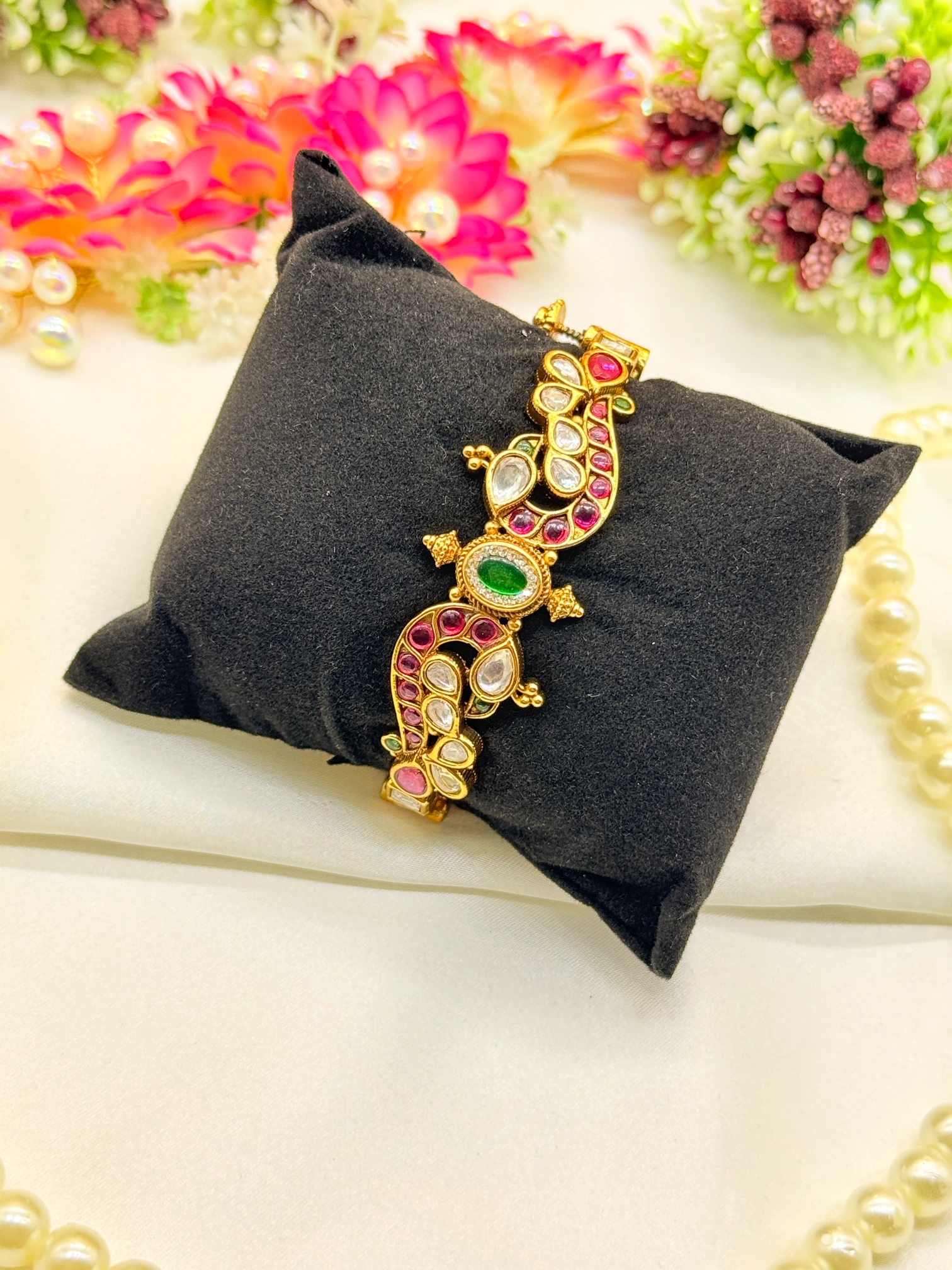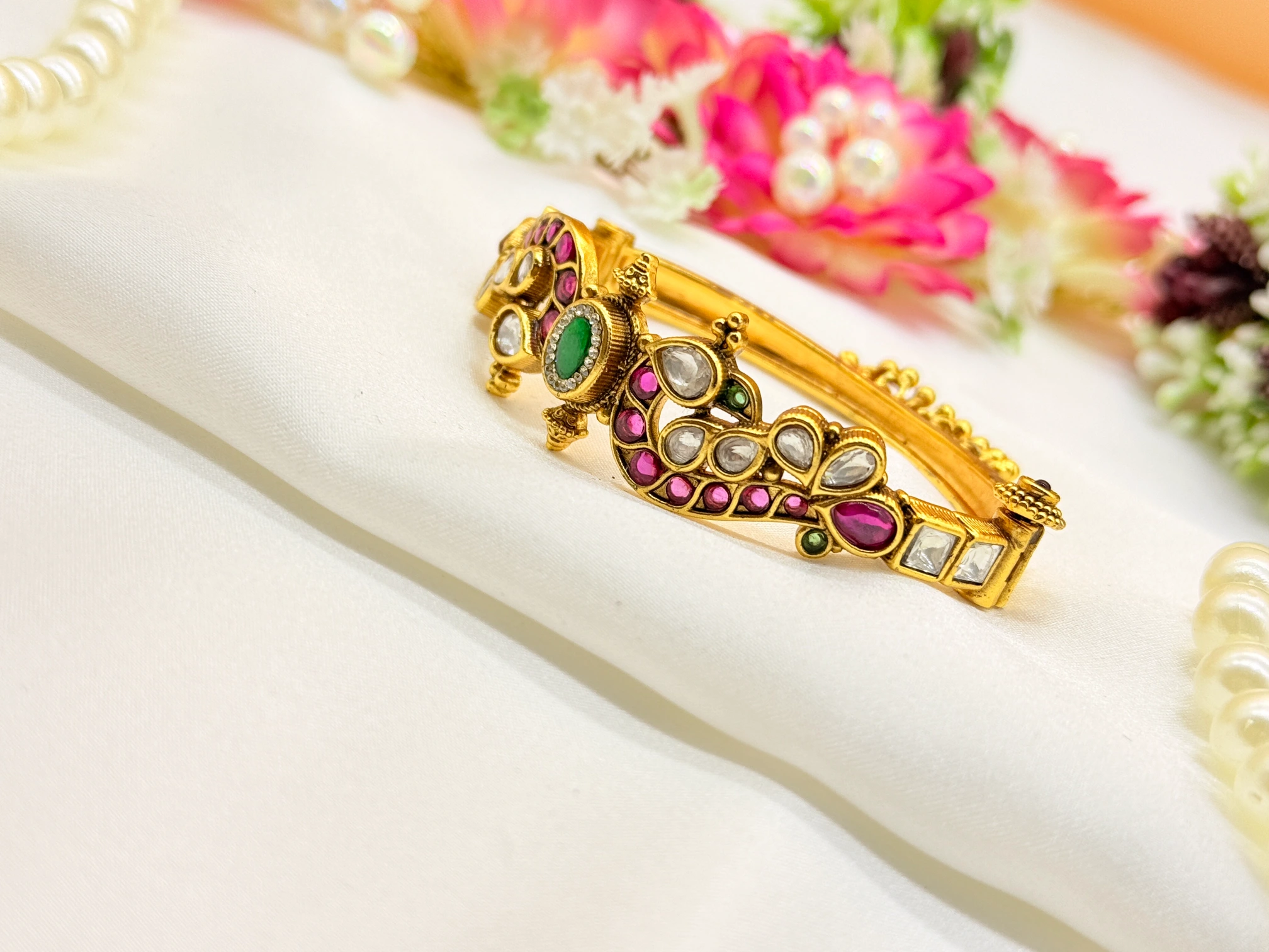 March 18, 2026This stunning gold-plated cuff bracelet features an elegant peacock-inspired design adorned with traditional kundan work and vibrant multicolor stones. Its intricate craftsmanship and rich detailing make it a perfect statement piece for weddings, festive occasions, and ethnic ensembles.