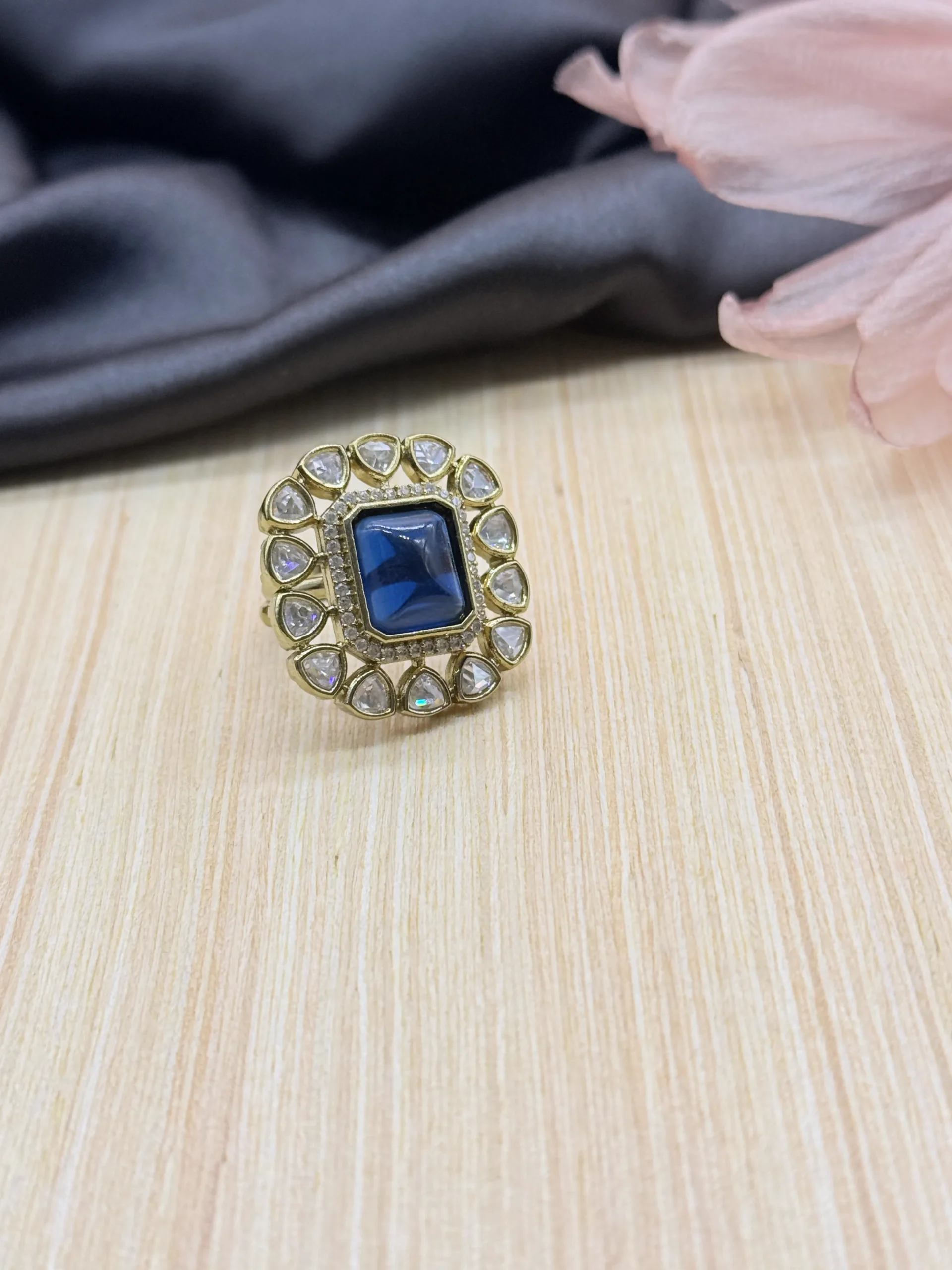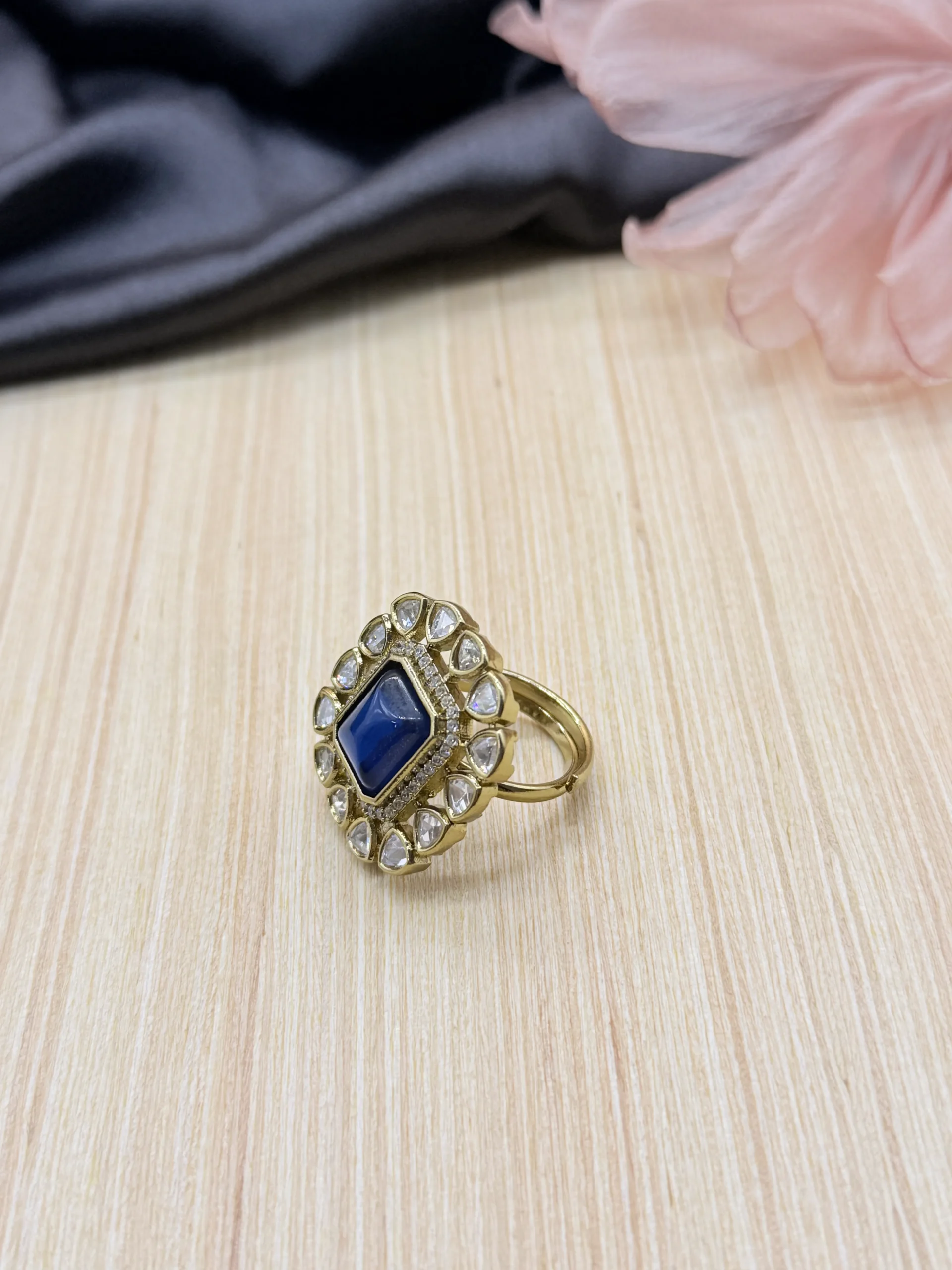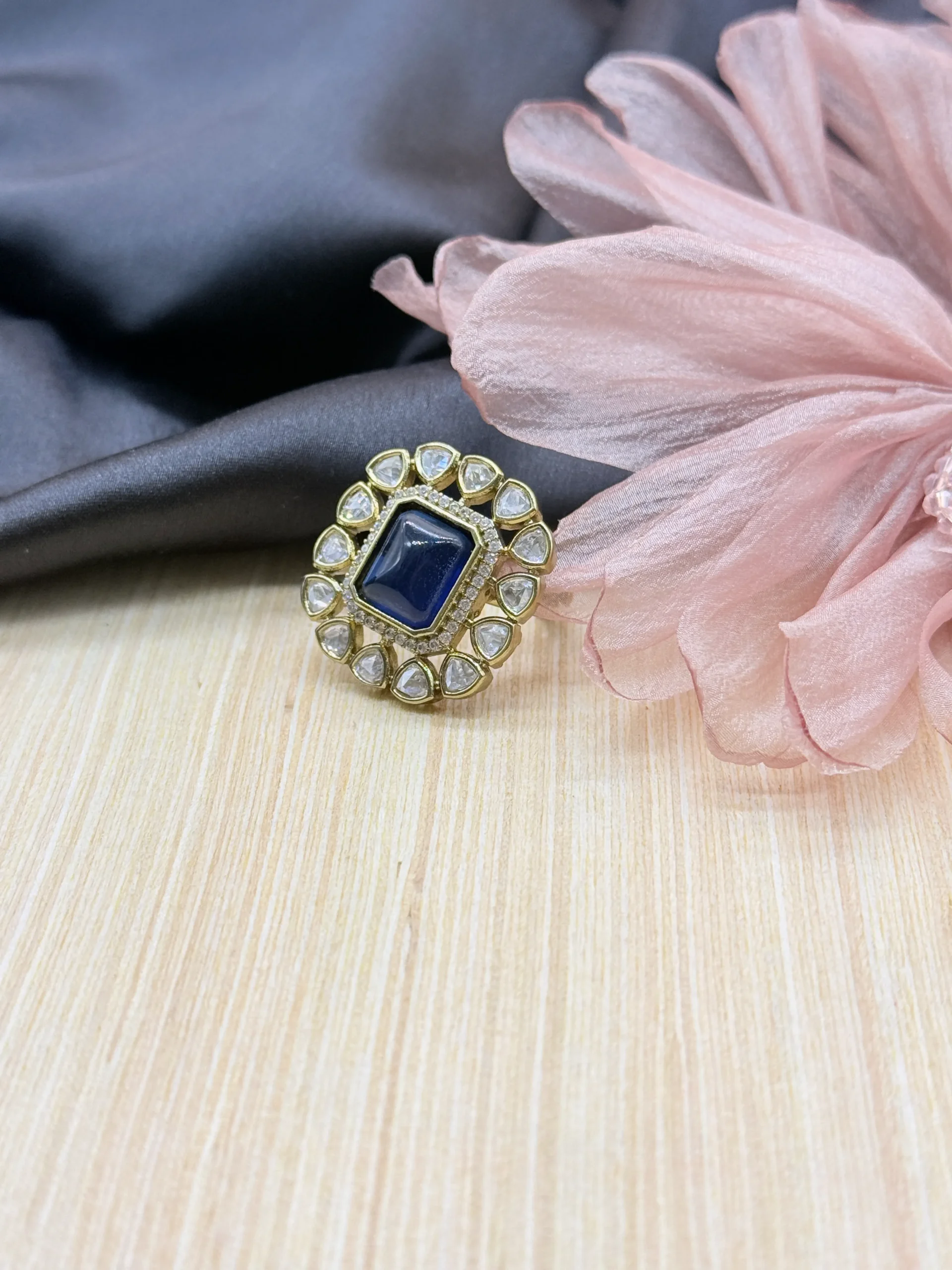 This gorgeous statement ring features a deep midnight blue square-cut centerpiece surrounded by sparkling crystal halo accents in a premium gold-plated finish. Perfect for parties, weddings, and festive occasions, it adds a bold royal touch to your elegant jewellery collection.