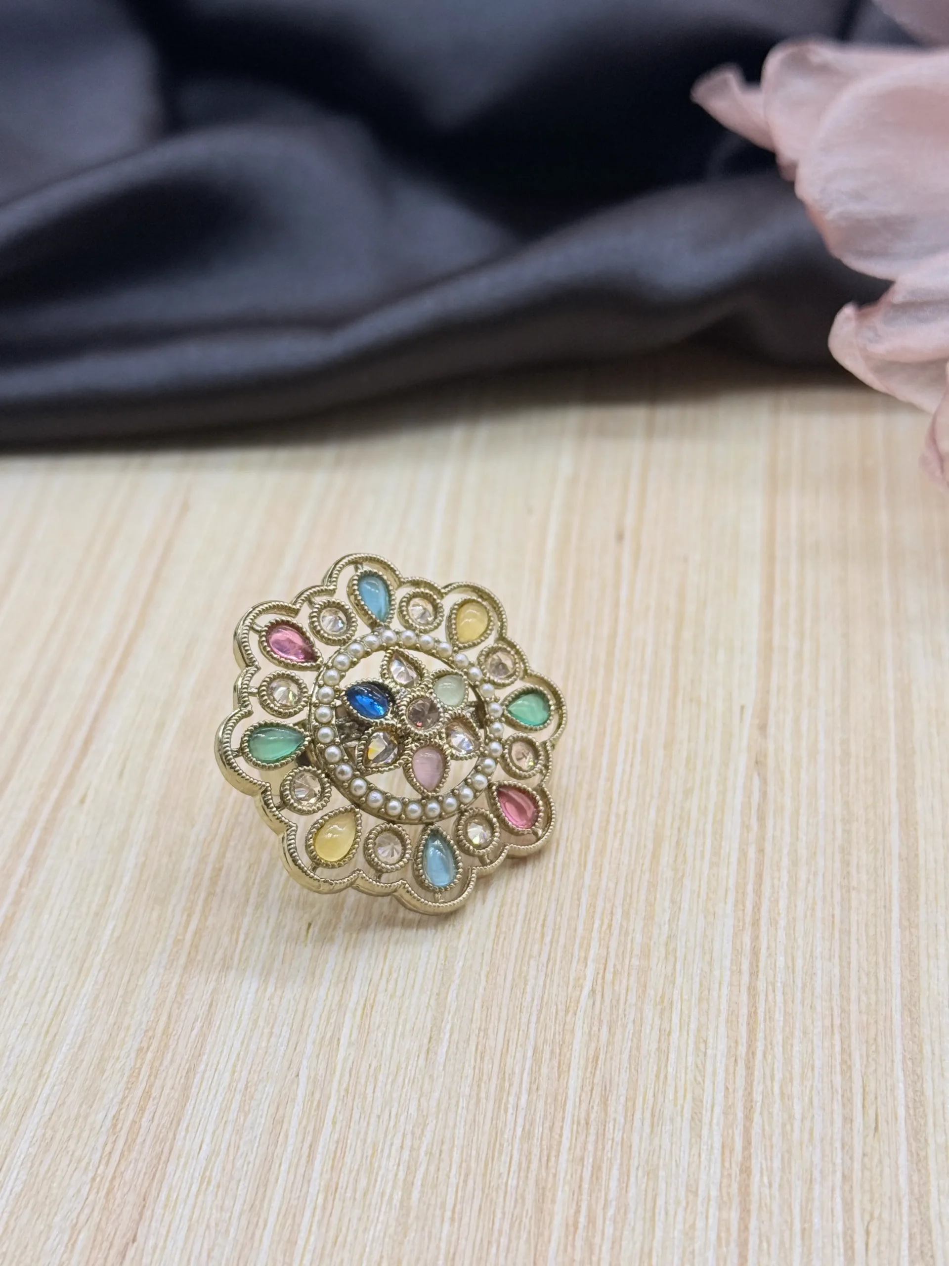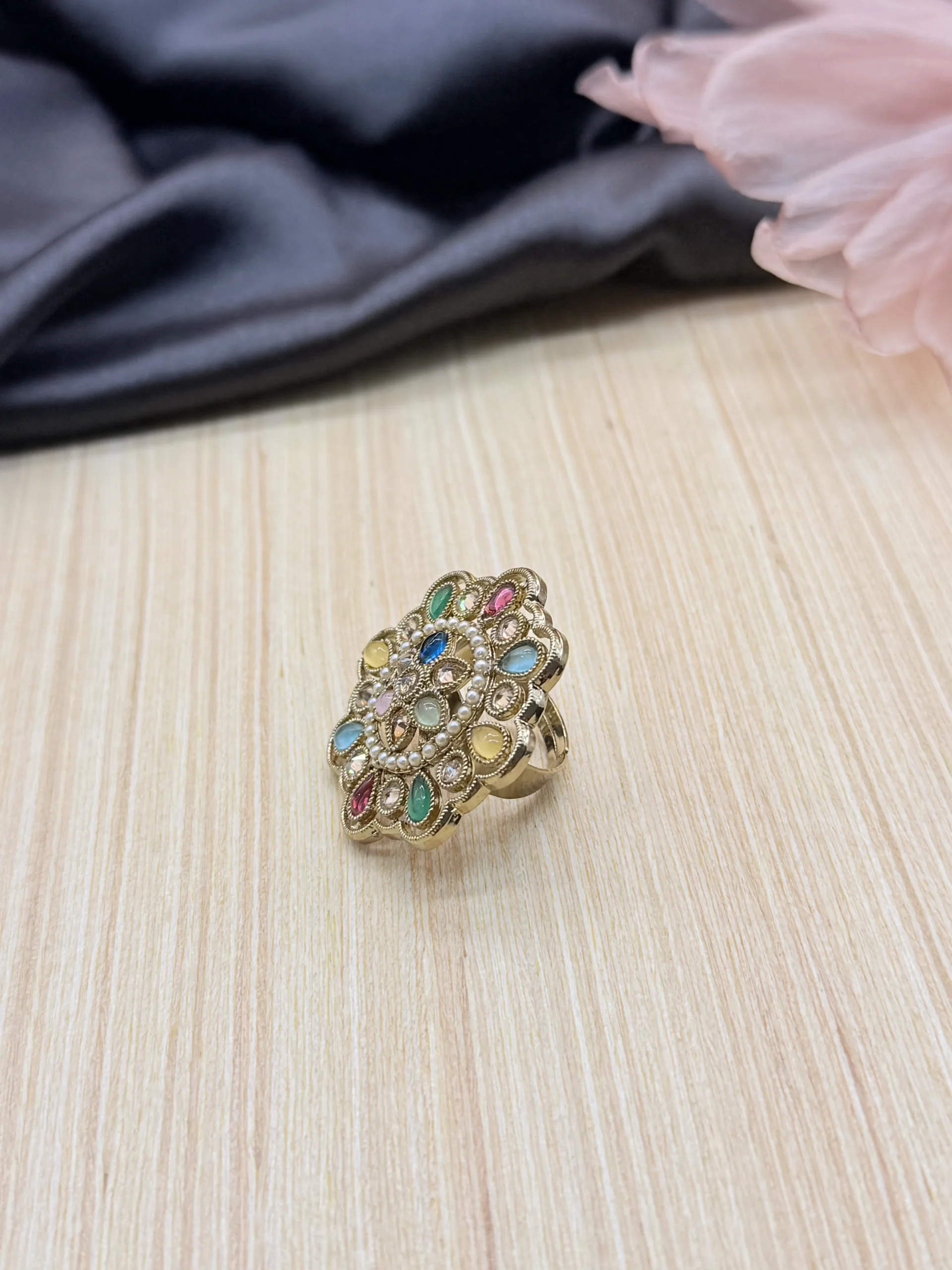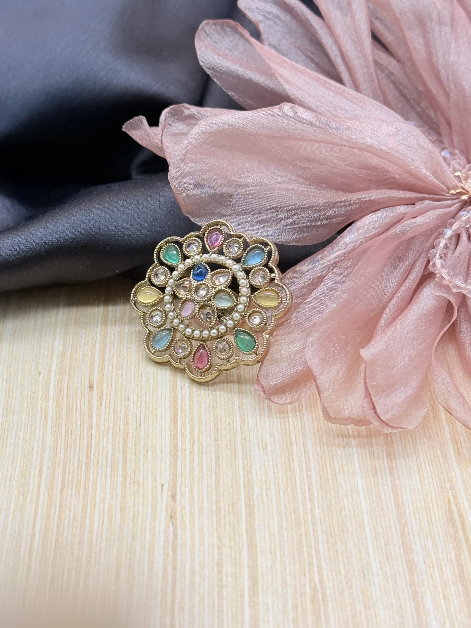 This vibrant statement ring features a stunning floral design with multicolor gemstone accents and sparkling kundan-style crystals in a rich gold-plated finish. Ideal for festive celebrations, weddings, and ethnic wear, it adds a bold and graceful touch to any jewellery collection.