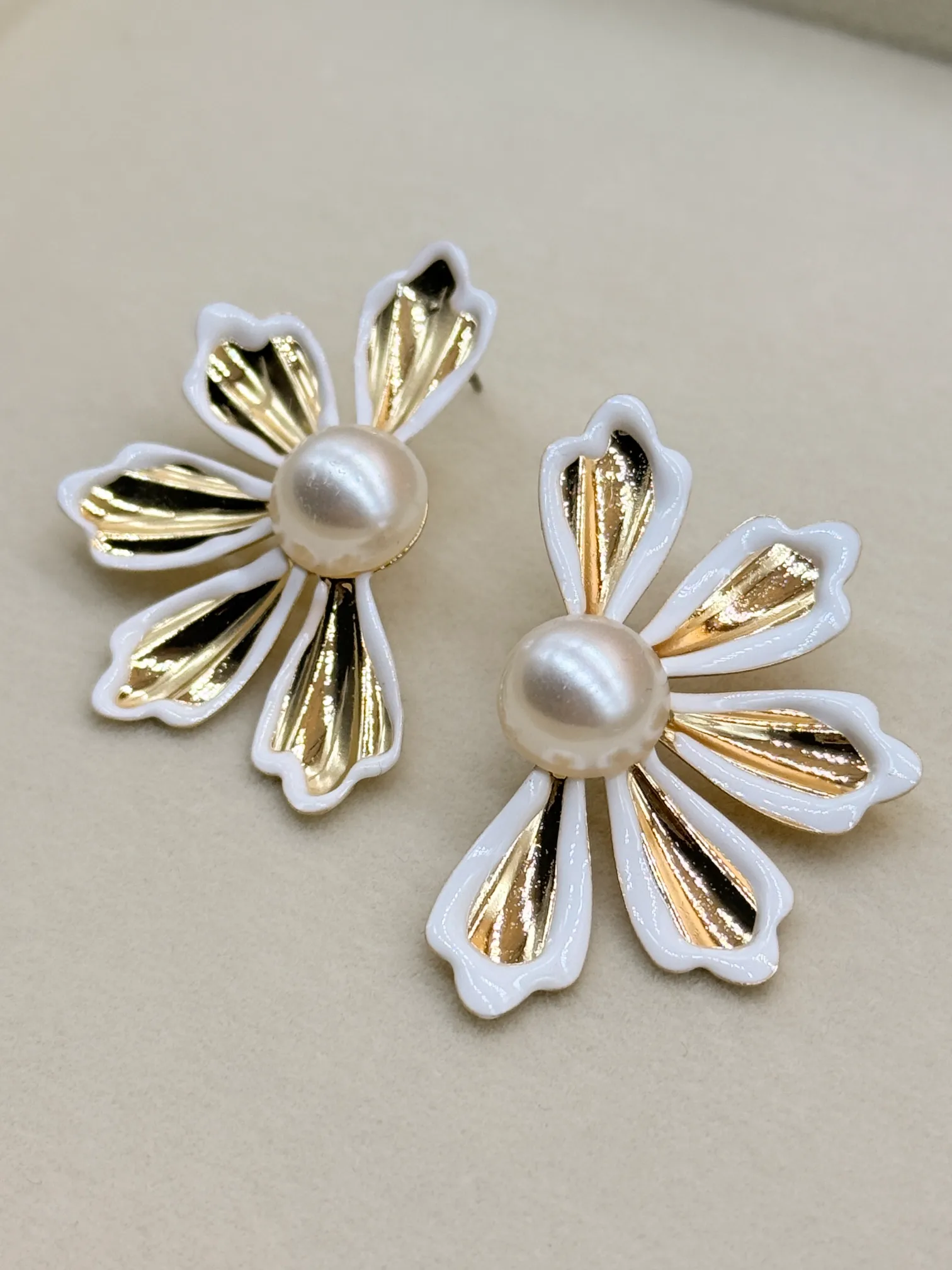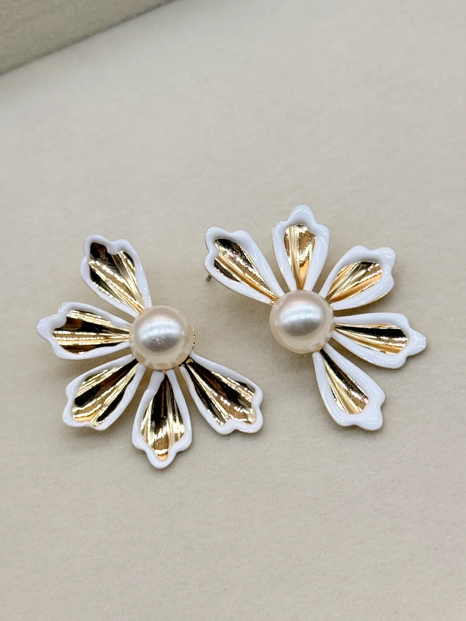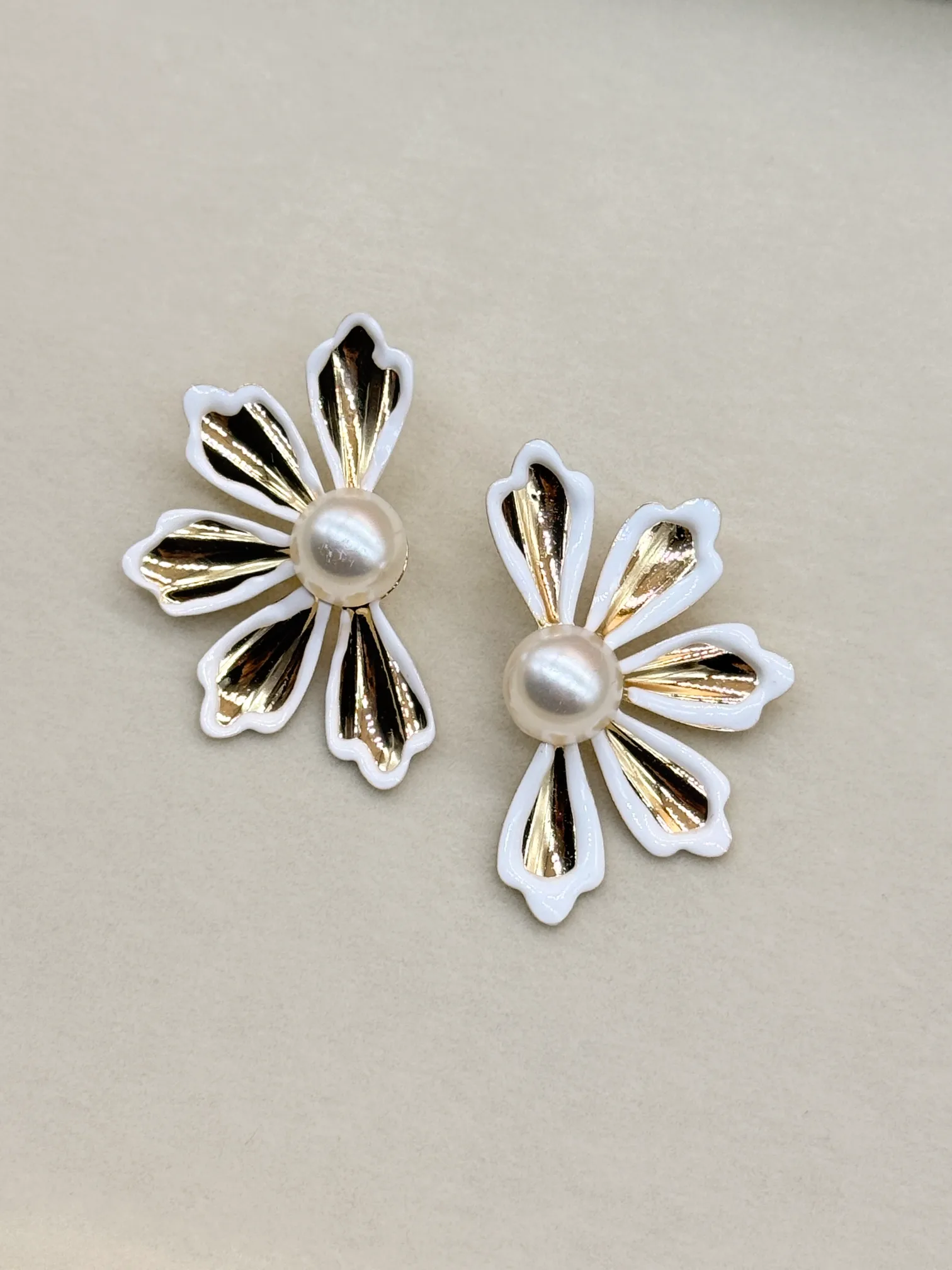 February 19, 2026Beautiful floral stud earrings designed with a luminous pearl centerpiece and textured gold-plated petals finished with a soft white enamel outline. The delicate and elegant look makes it perfect for both daily wear and special occasions. Lightweight and comfortable for all-day styling.