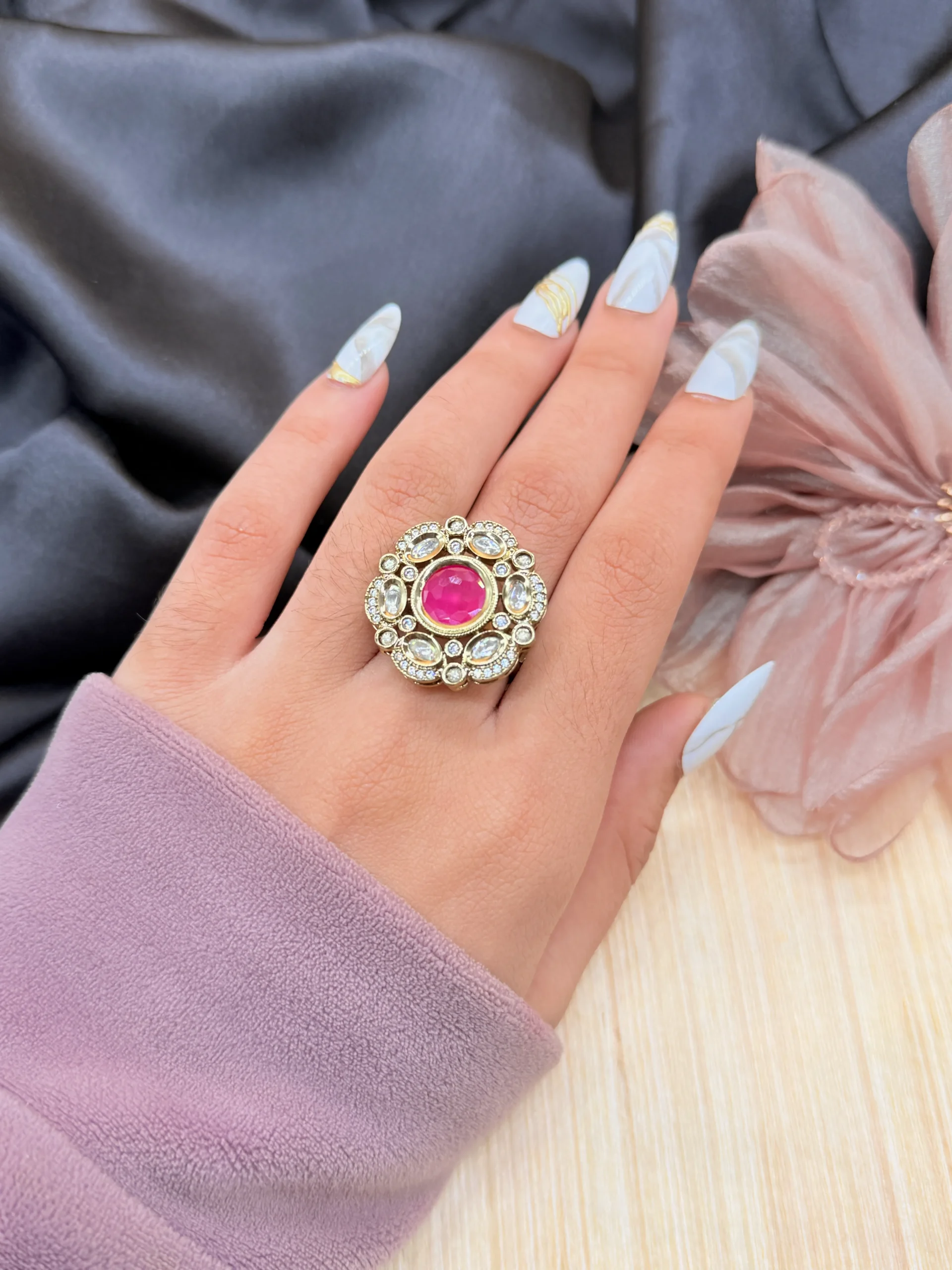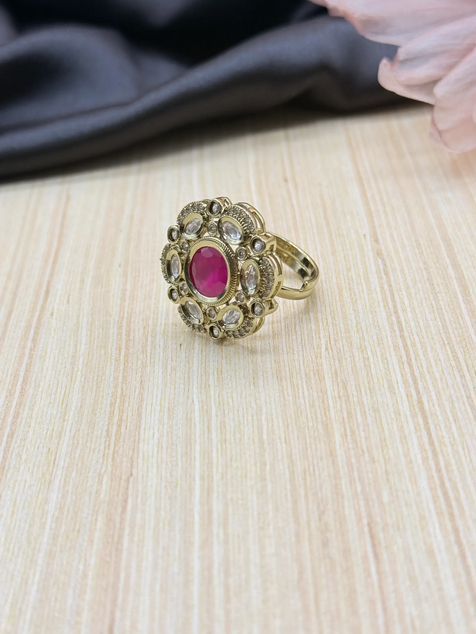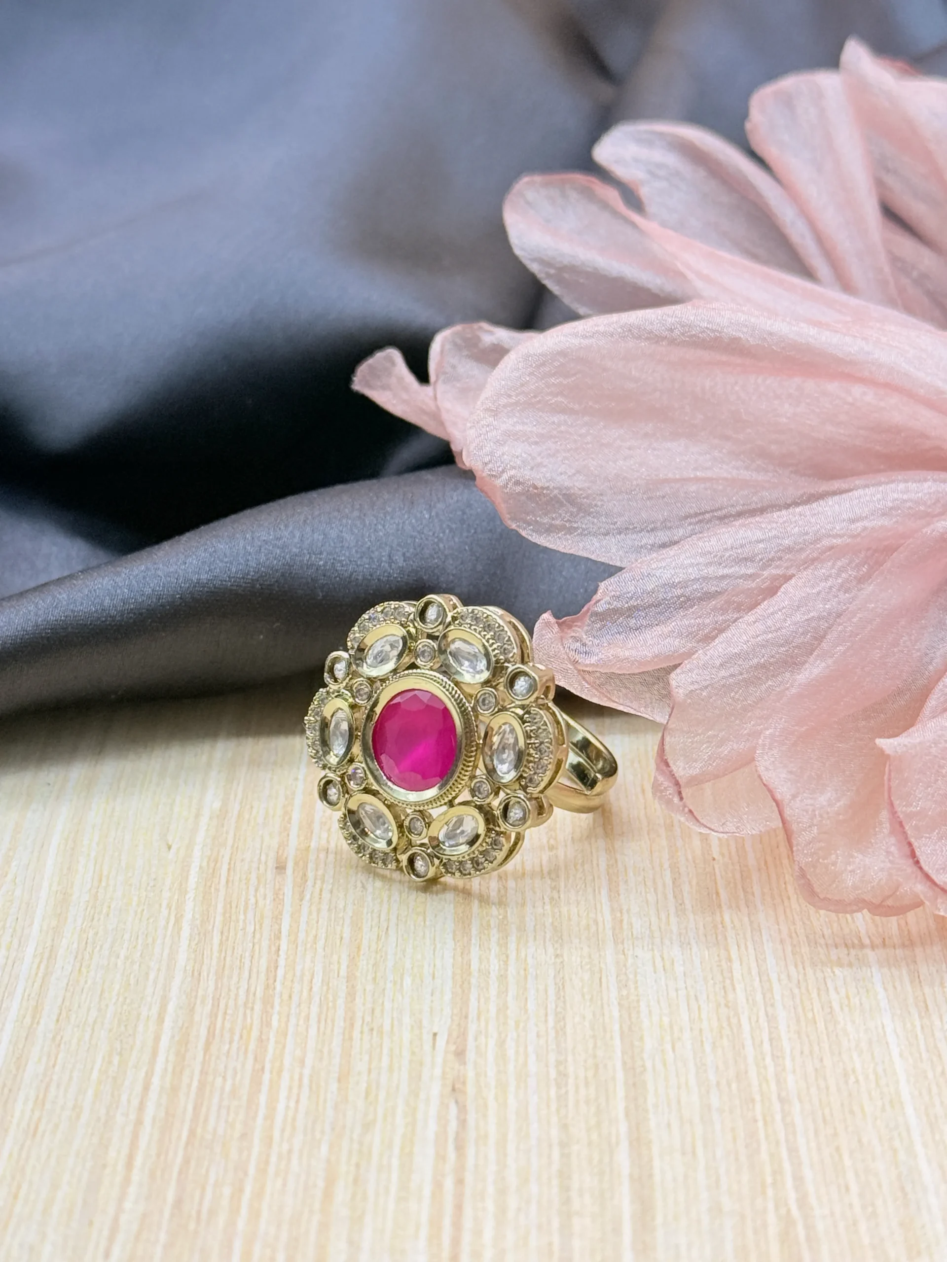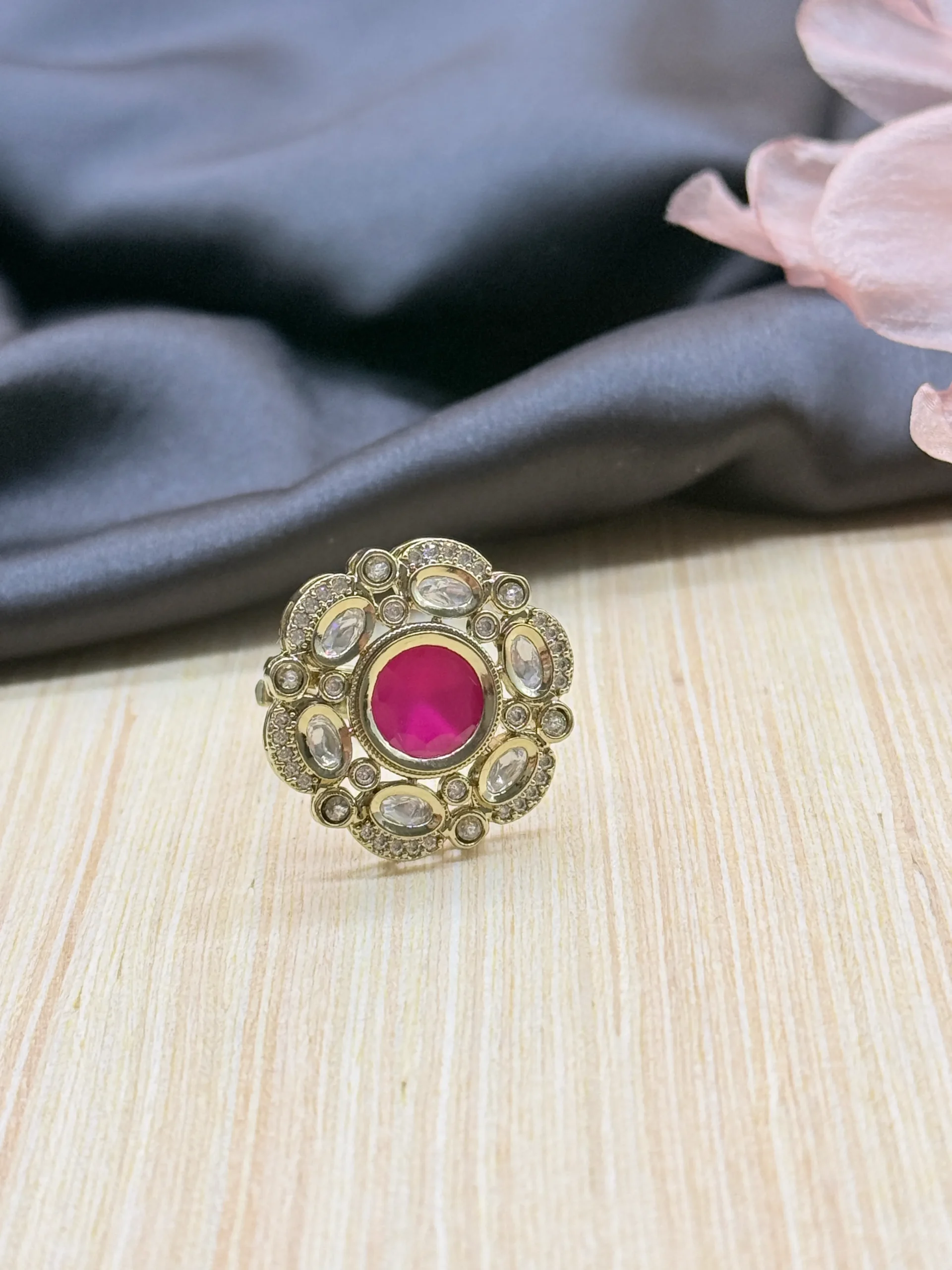 This stunning statement ring features a vibrant ruby pink center stone surrounded by sparkling crystal accents in a luxurious gold-plated finish. Perfect for weddings, festive occasions, and party wear, it adds a bold touch of elegance and glamour to your jewellery collection.