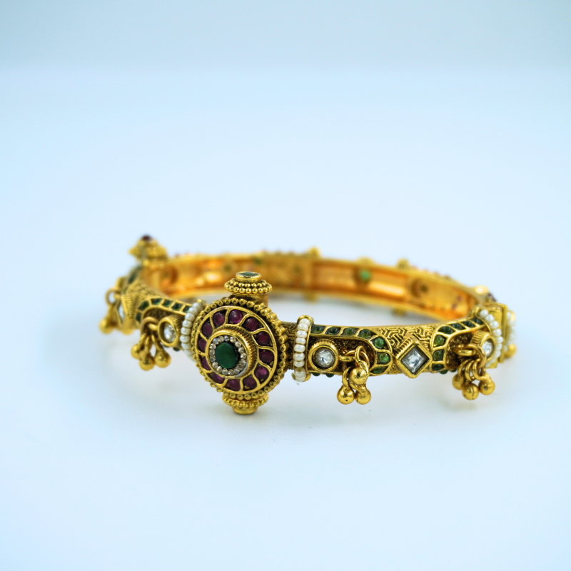 LALEEZ Fashion Jewellery | Antique Gold-Plated Carved Emerald Round Kundan Heritage Bangle Bracelet | Ideal for Women – 109