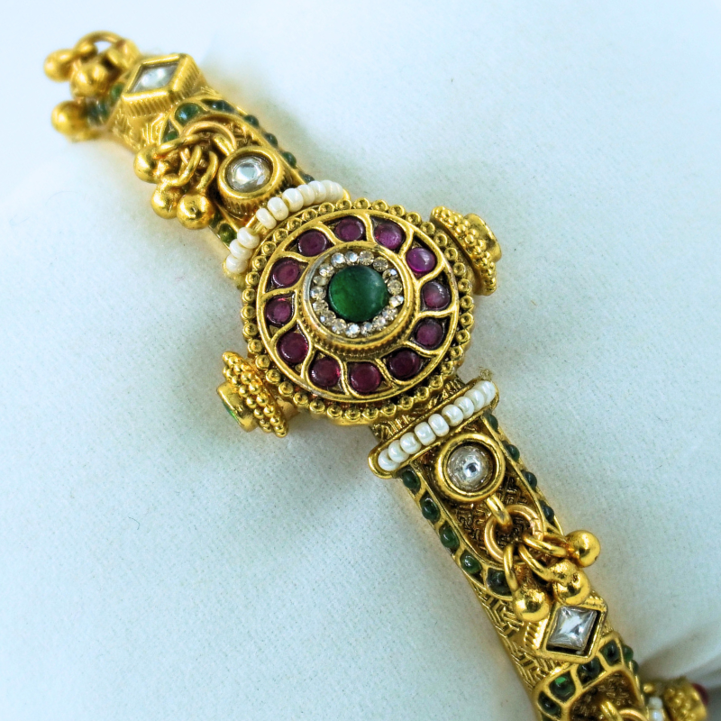 November 19, 2025This ornate bracelet features a circular kundan centerpiece surrounded by ruby-green stones and delicate temple-style charms. Its intricate detailing and traditional aesthetics make it a perfect accessory for festive and ethnic occasions.