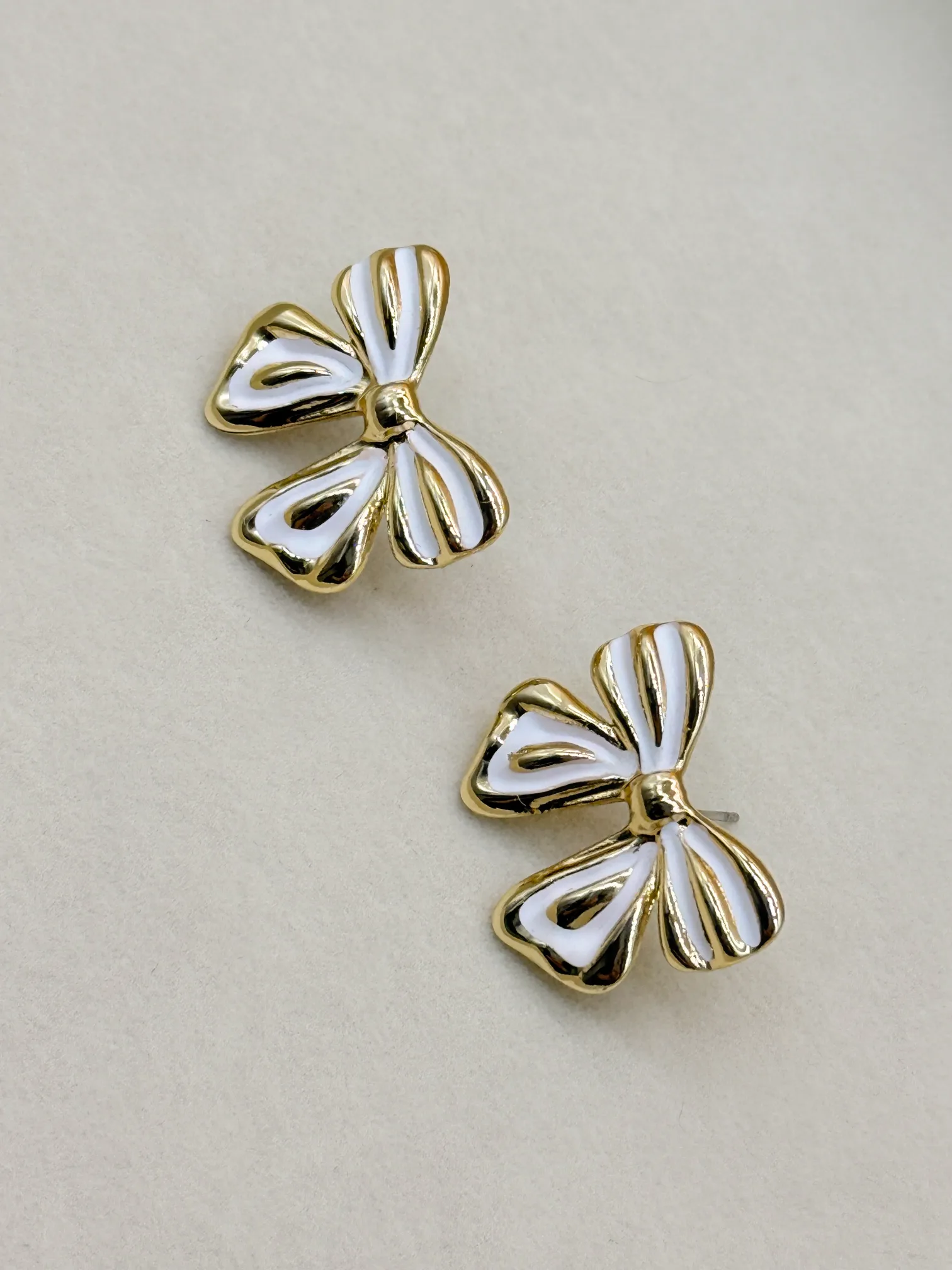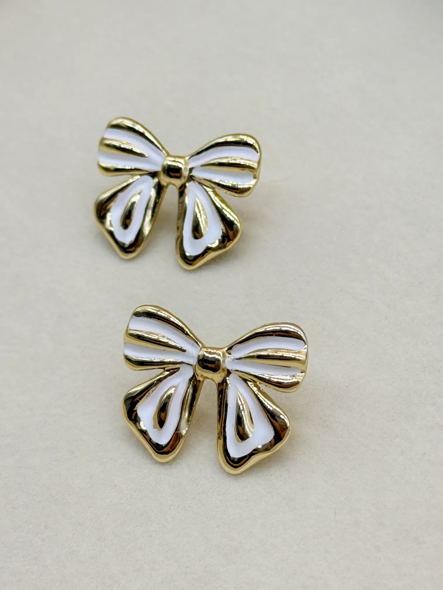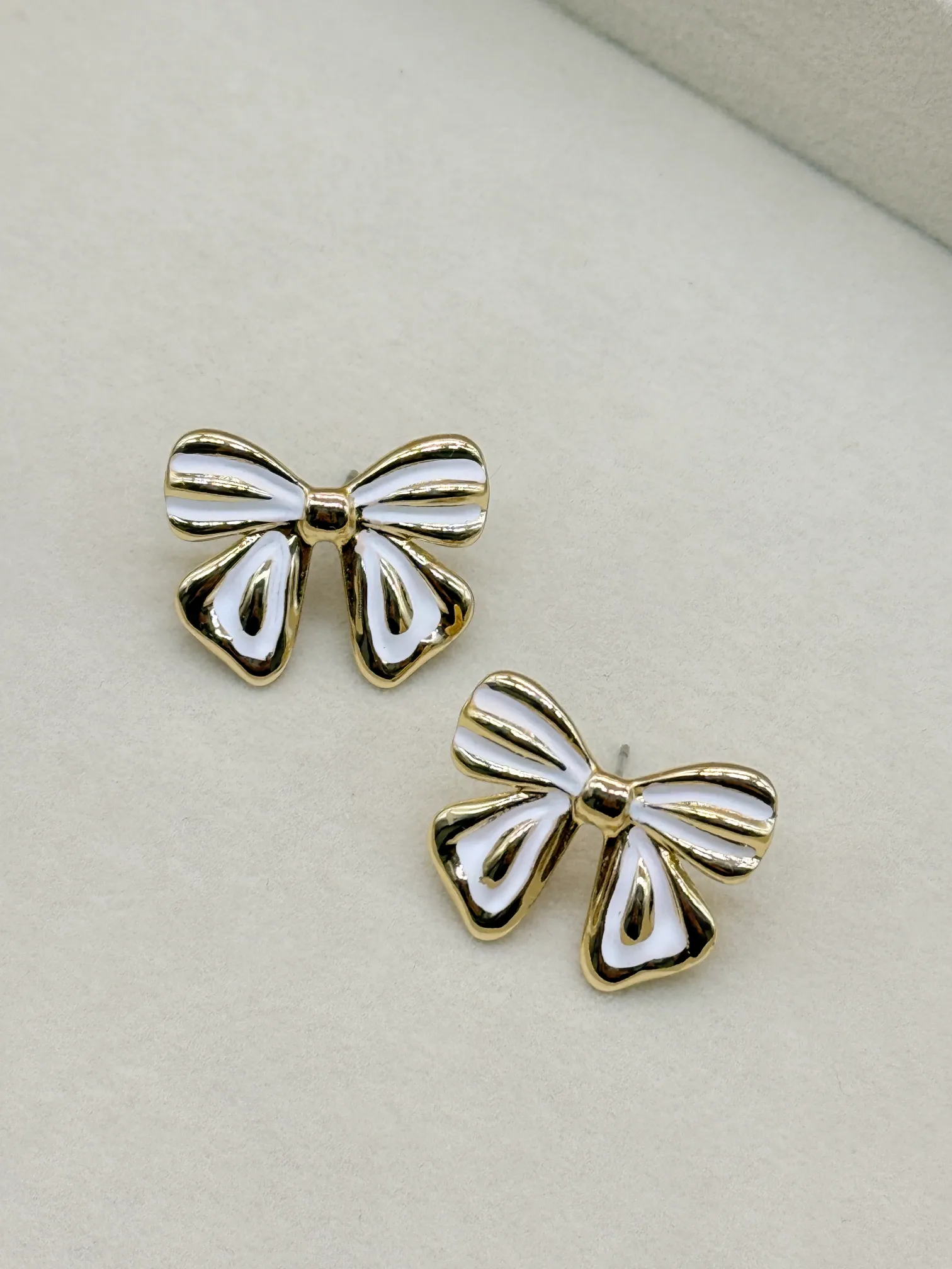 February 19, 2026Elevate your everyday style with these elegant bow-shaped stud earrings featuring a smooth white enamel finish beautifully outlined in gold plating. With their graceful and feminine charm, these studs are perfect for adding a subtle yet stylish touch to both casual and occasion wear.