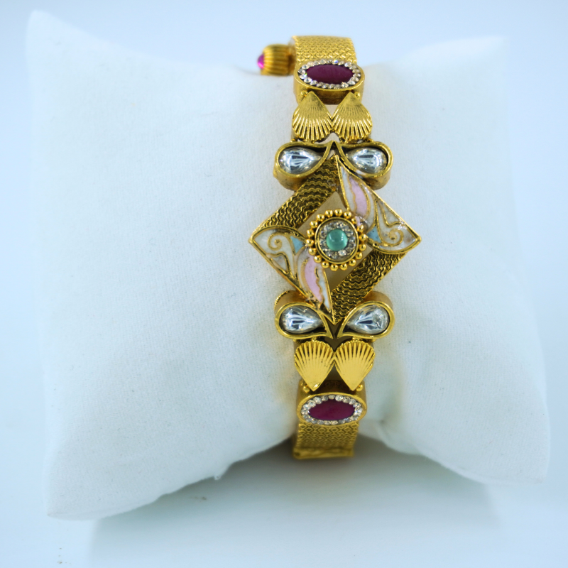 November 19, 2025This elegant gold-toned bangle features intricate enamel detailing paired with classic kundan stones, giving it a royal and timeless appeal. Designed for festive and special occasions, it adds a refined traditional charm to any outfit.