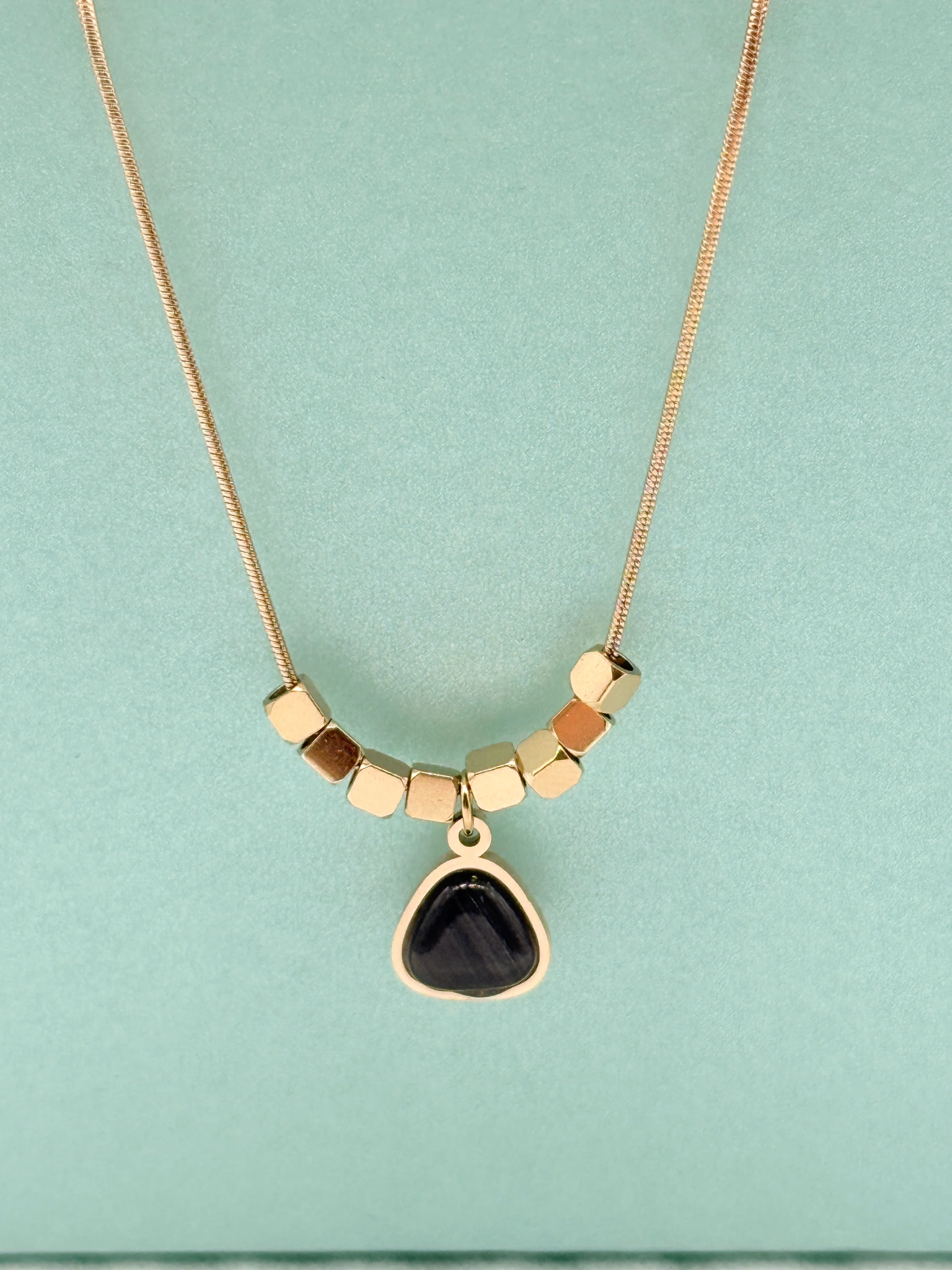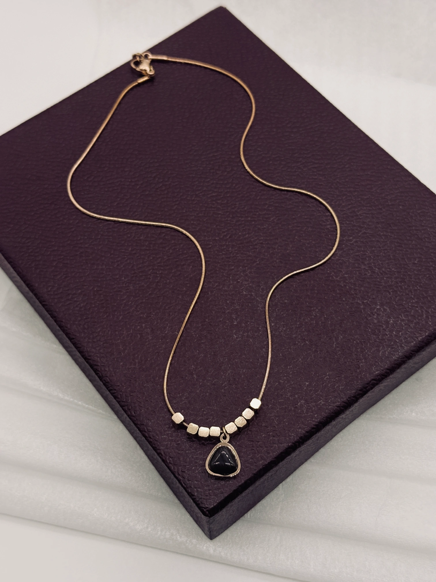 March 9, 2026This stylish chain features a sleek black teardrop stone pendant paired with modern geometric rose gold beads for a contemporary look. The delicate chain and minimal design create a perfect balance of elegance and sophistication. Ideal for everyday wear, it adds a subtle yet striking charm to any outfit.