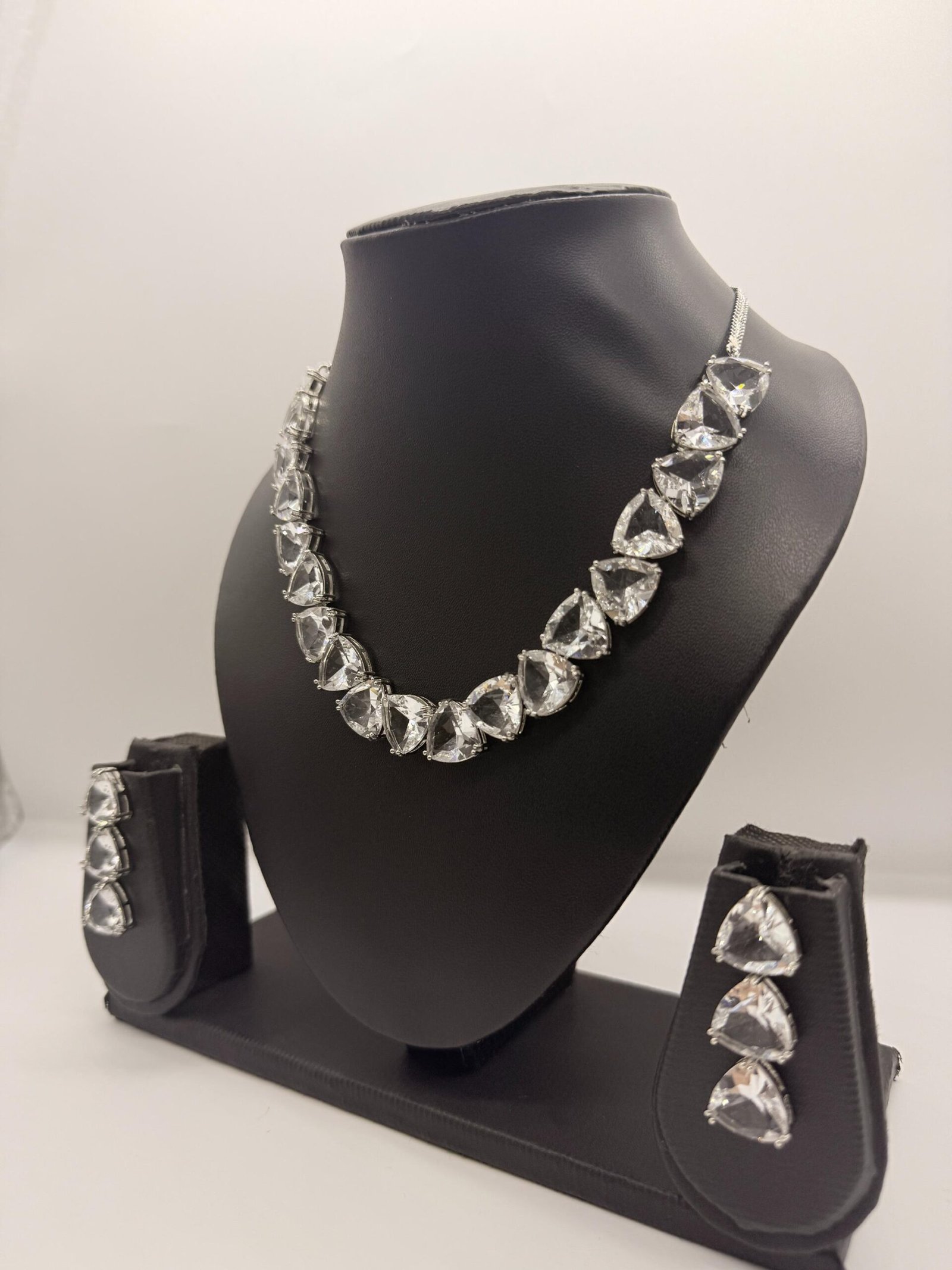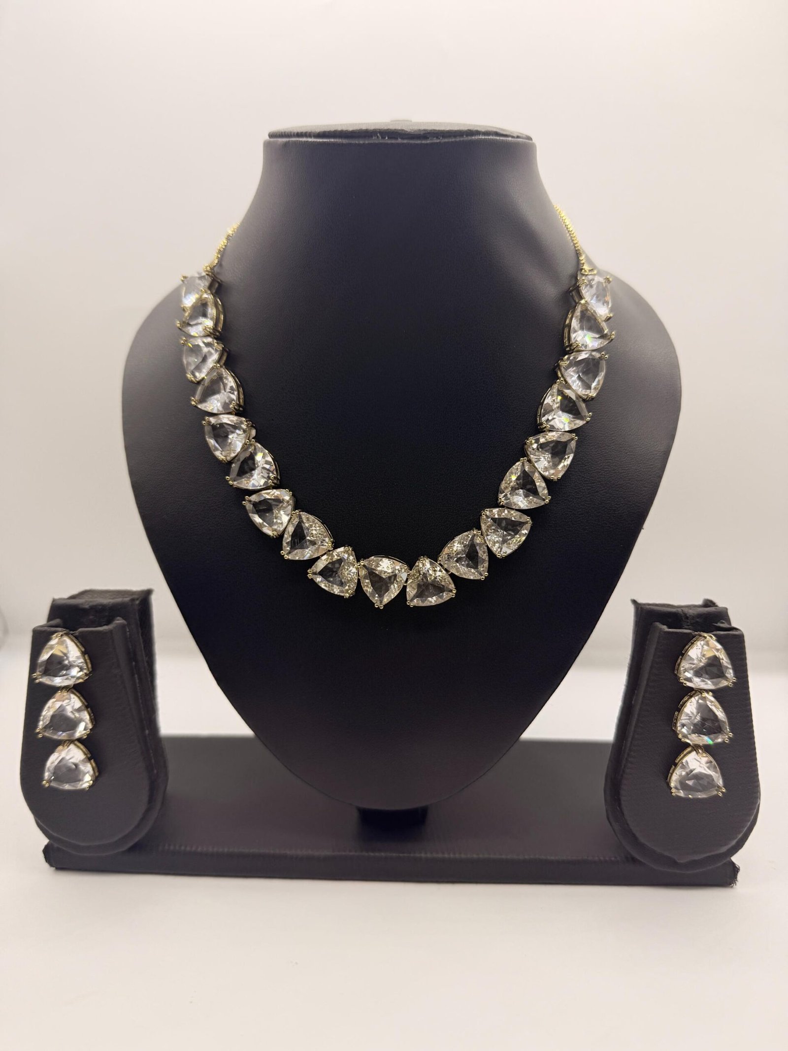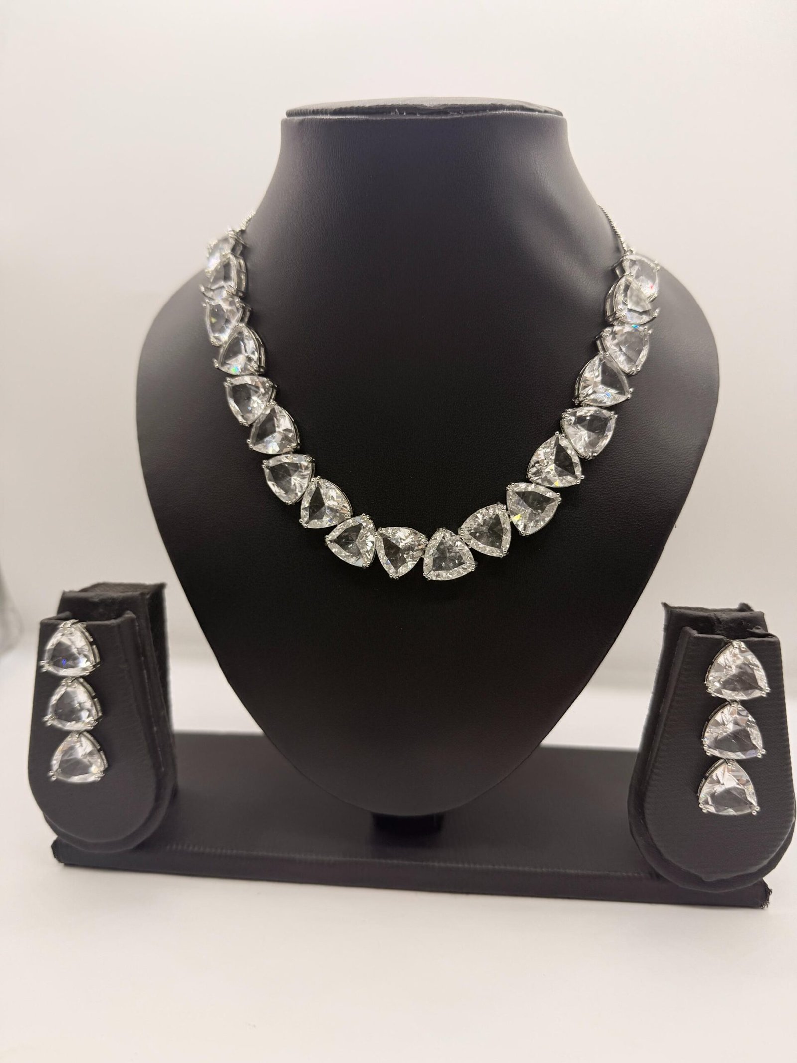 This elegant necklace set features finely cut clear crystal teardrop stones arranged in a timeless silhouette with a rose gold-plated finish. Designed for understated glamour, it is perfect for weddings, parties, and formal occasions, adding a refined sparkle and classic charm to any outfit.