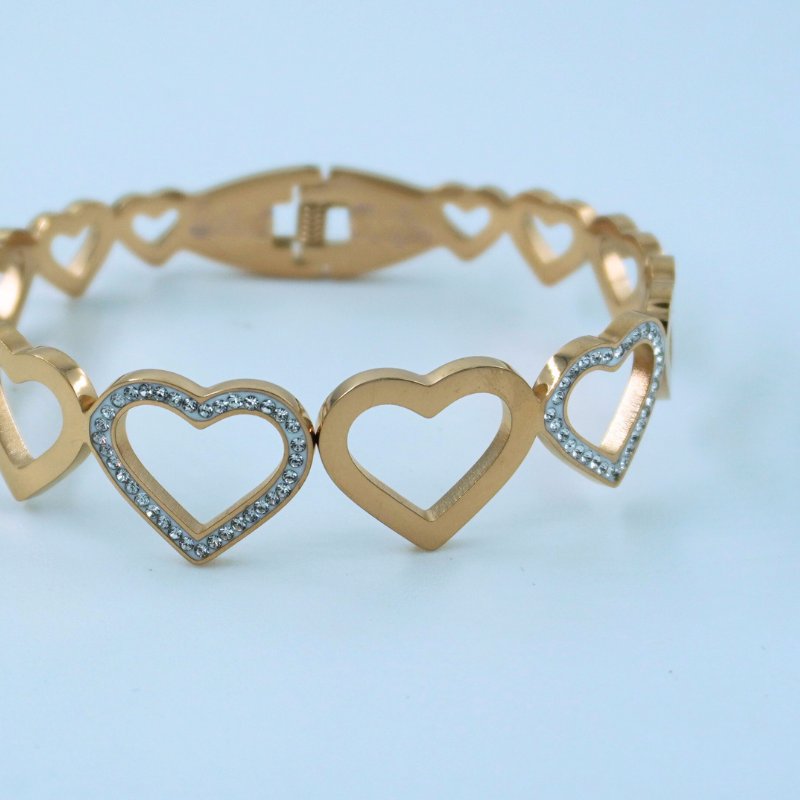 November 19, 2025This adorable bracelet features a series of hollow heart links, highlighted with a crystal-studded centerpiece for a delicate, romantic appeal. Its soft rose-gold finish makes it perfect for daily wear, gifting, and special occasions.