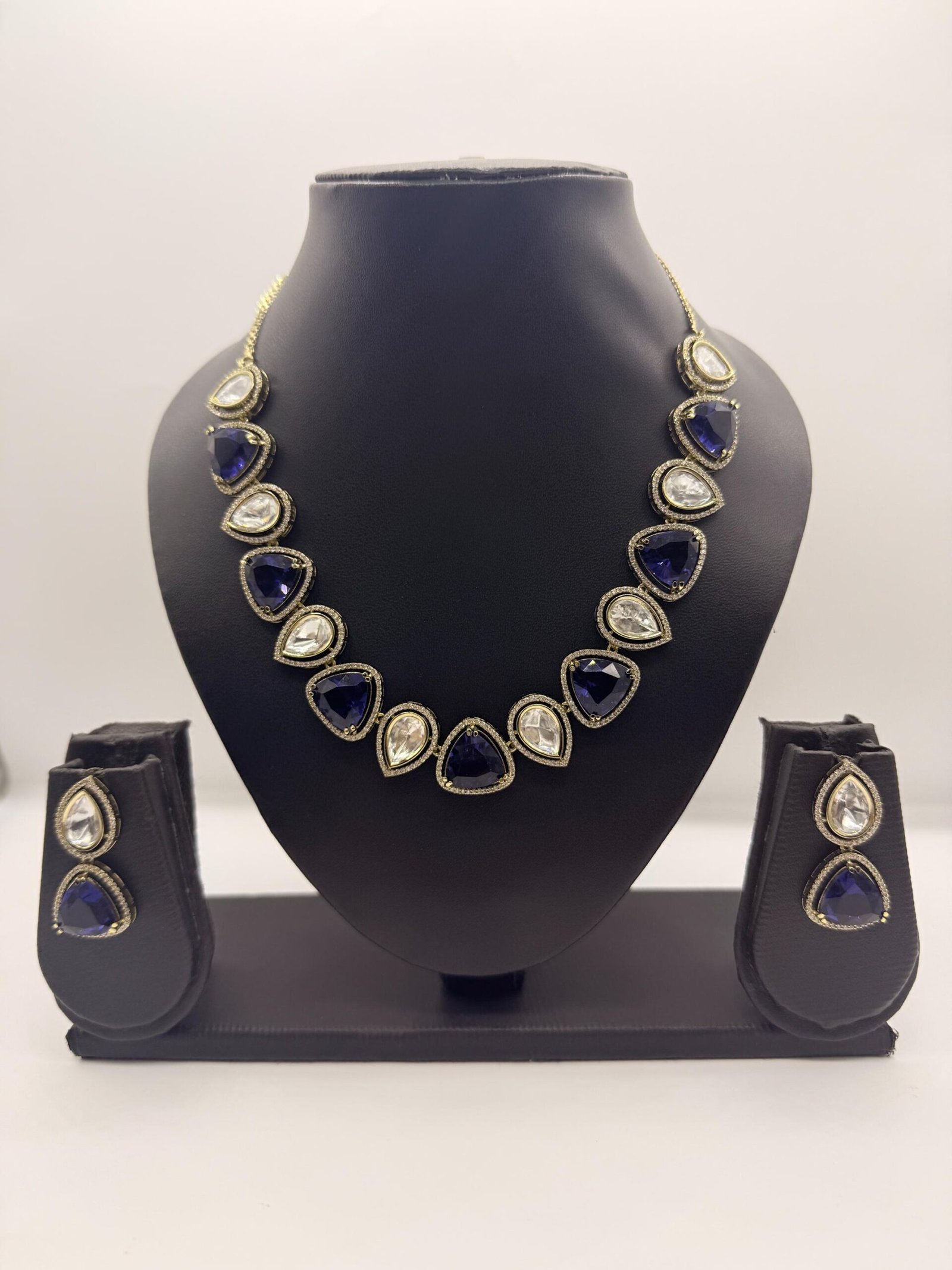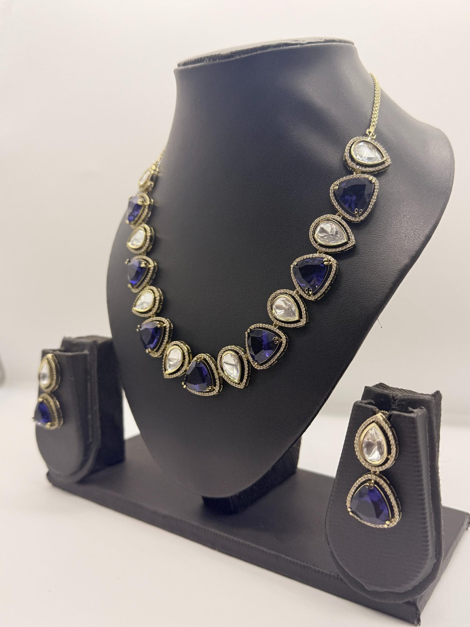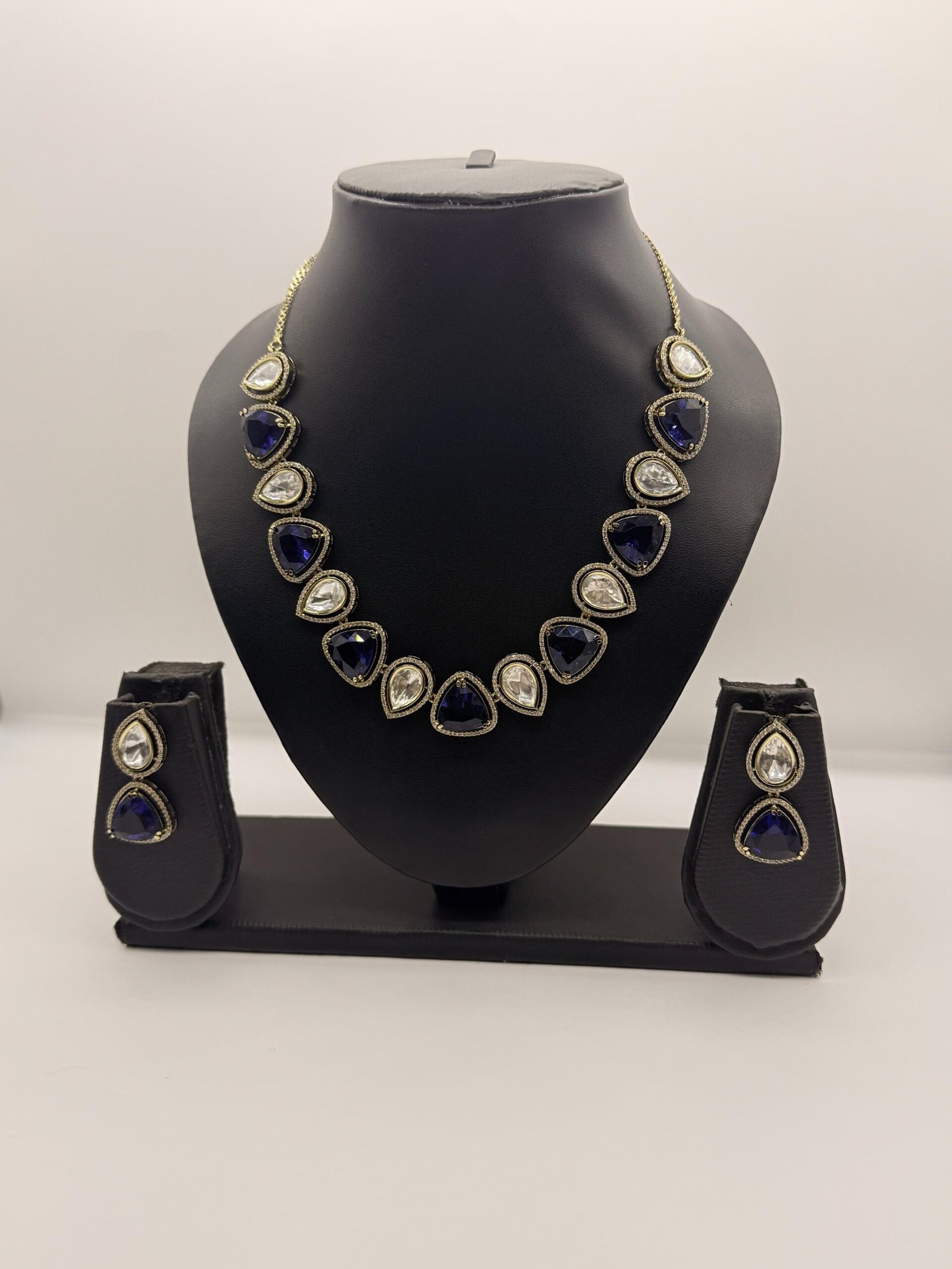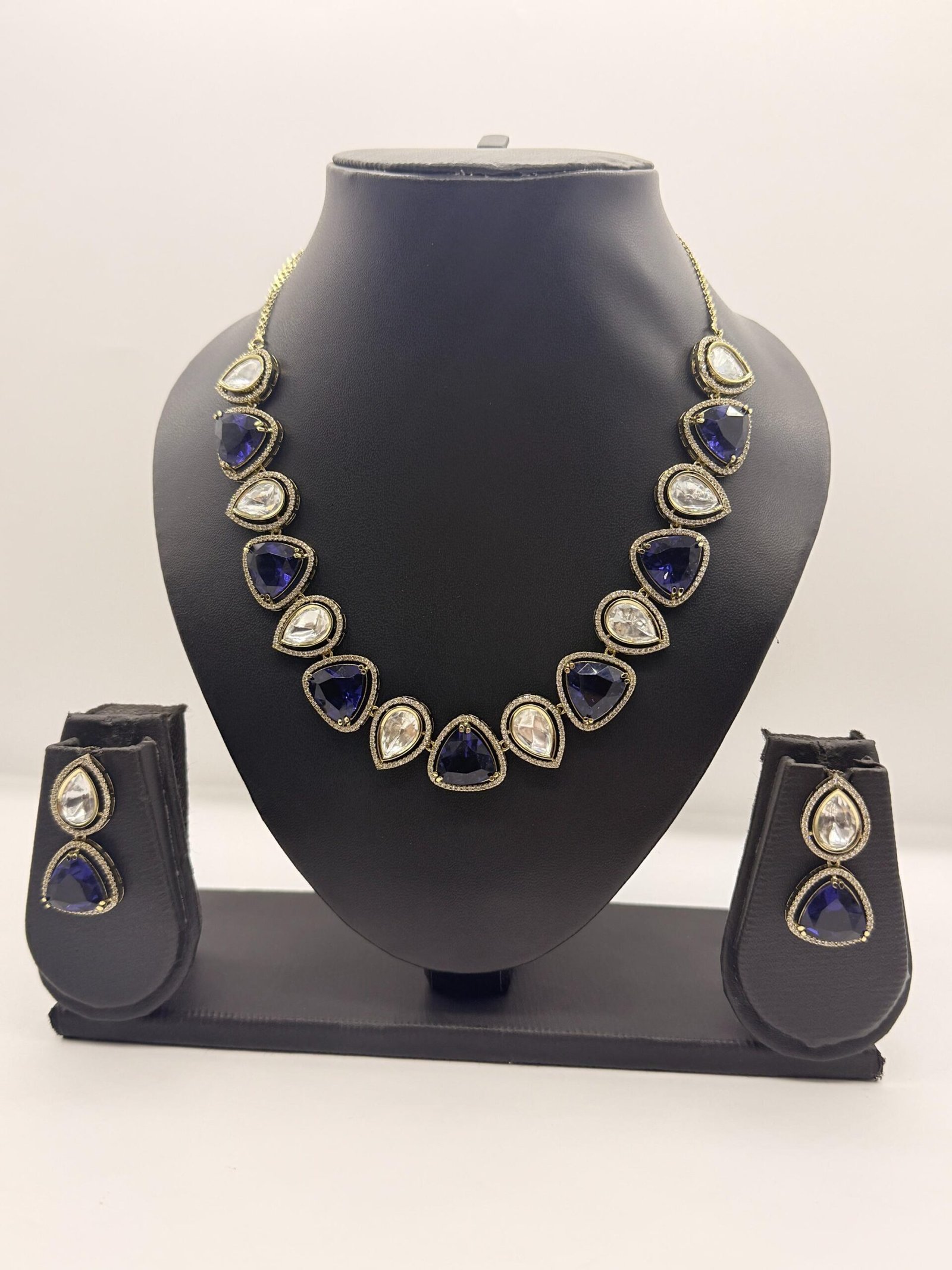 This elegant necklace set features deep sapphire-blue teardrop stones paired with shimmering crystal accents, beautifully framed in a rose gold-plated finish. Designed to make a graceful statement, it is perfect for weddings, festive occasions, and evening celebrations, adding timeless charm and luxury to any outfit.