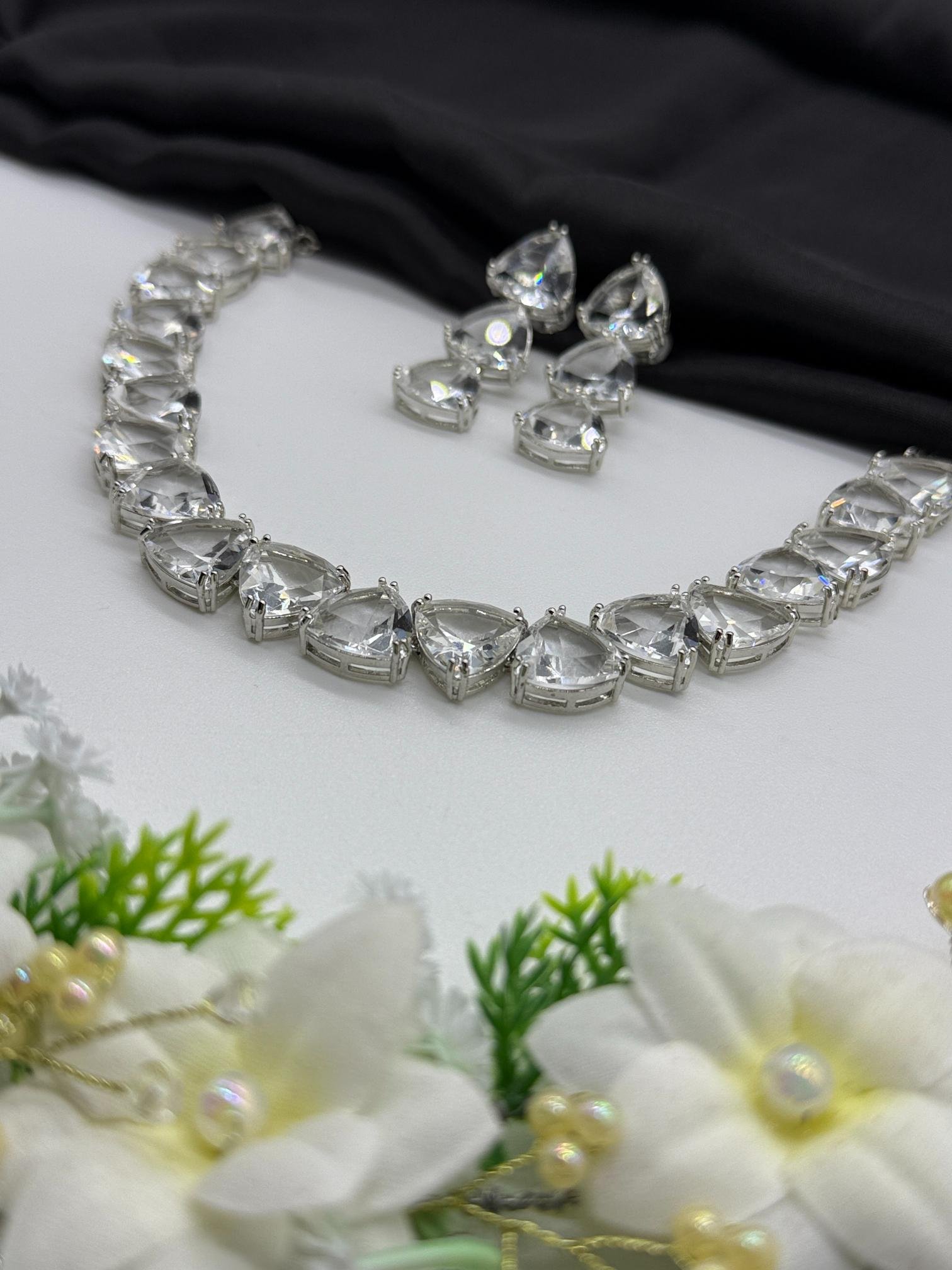This timeless necklace set features brilliantly cut clear teardrop crystals set in a sleek silver-plated finish, offering a refined and elegant look. Ideal for weddings, receptions, and formal occasions, it adds subtle sparkle and classic sophistication to any ensemble.