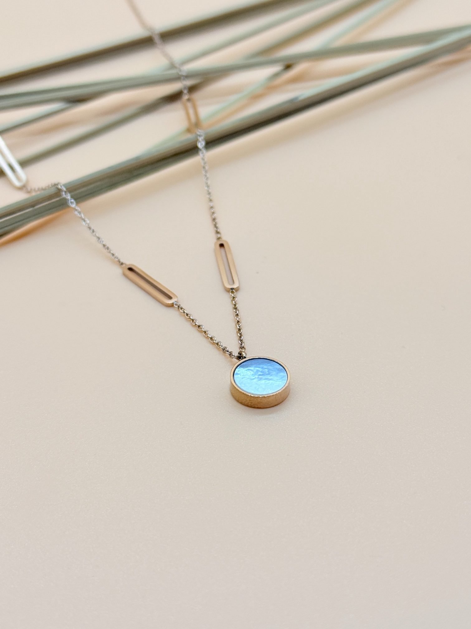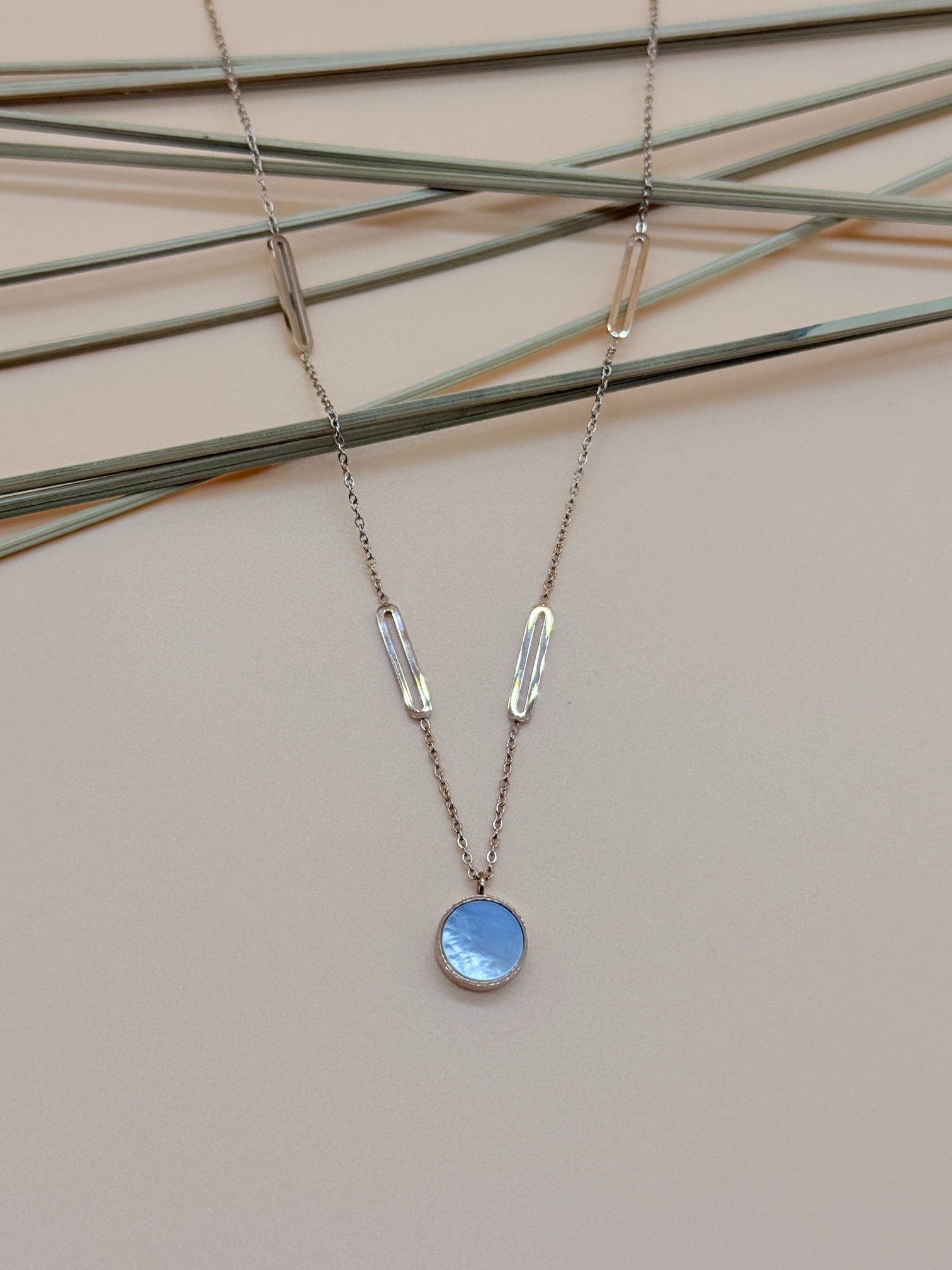 February 17, 2026This elegant necklace features a sleek silver-tone chain accented with modern elongated links and a round blue shell-style pendant that reflects soft light beautifully. The minimal yet classy geometric design makes it perfect for both daily wear and special occasions, adding a calm and graceful touch to any outfit.