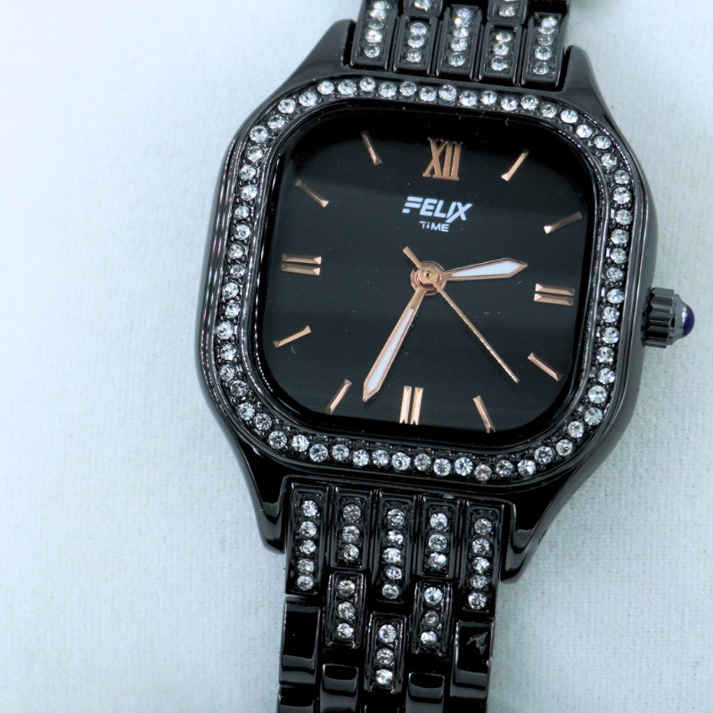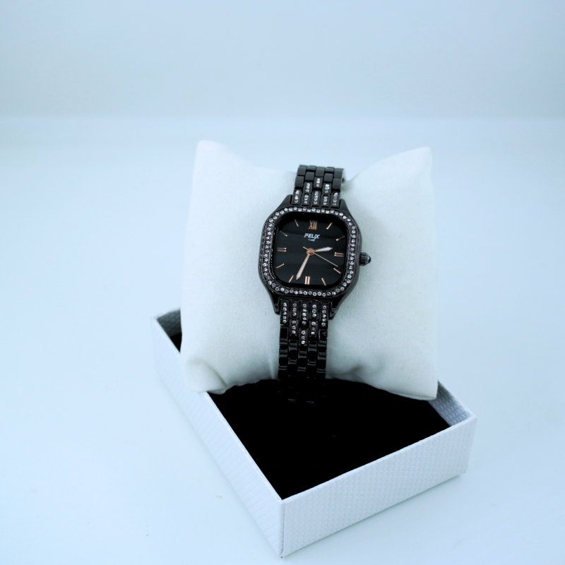 This premium women’s watch features a bold black dial paired with a crystal-studded black metal bracelet for a sophisticated, high-fashion look. Perfect for parties, festive occasions, and elegant everyday styling.