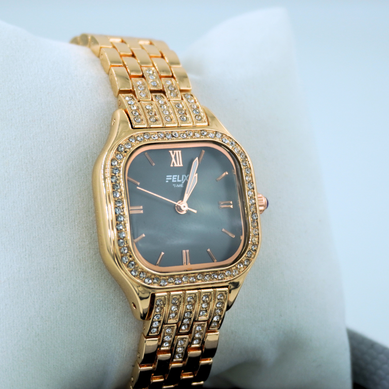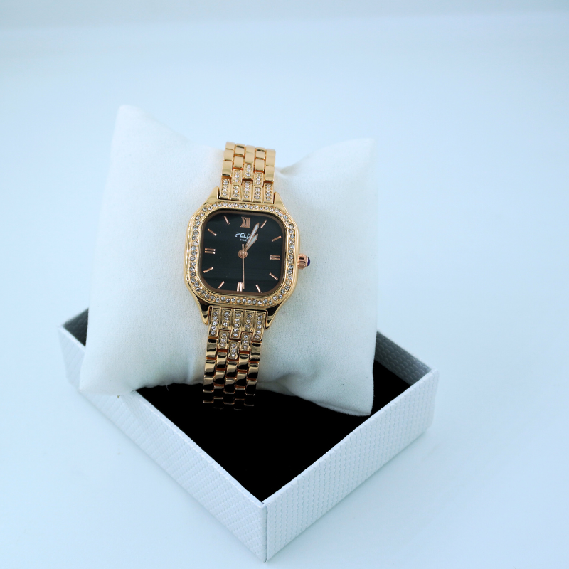 This premium women’s watch features a bold black dial paired with a crystal-embedded gold bracelet strap for a rich, luxurious look. Perfect for parties, festive occasions, and elegant styling, it adds timeless sophistication to any wardrobe.