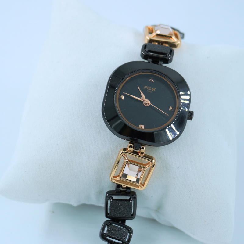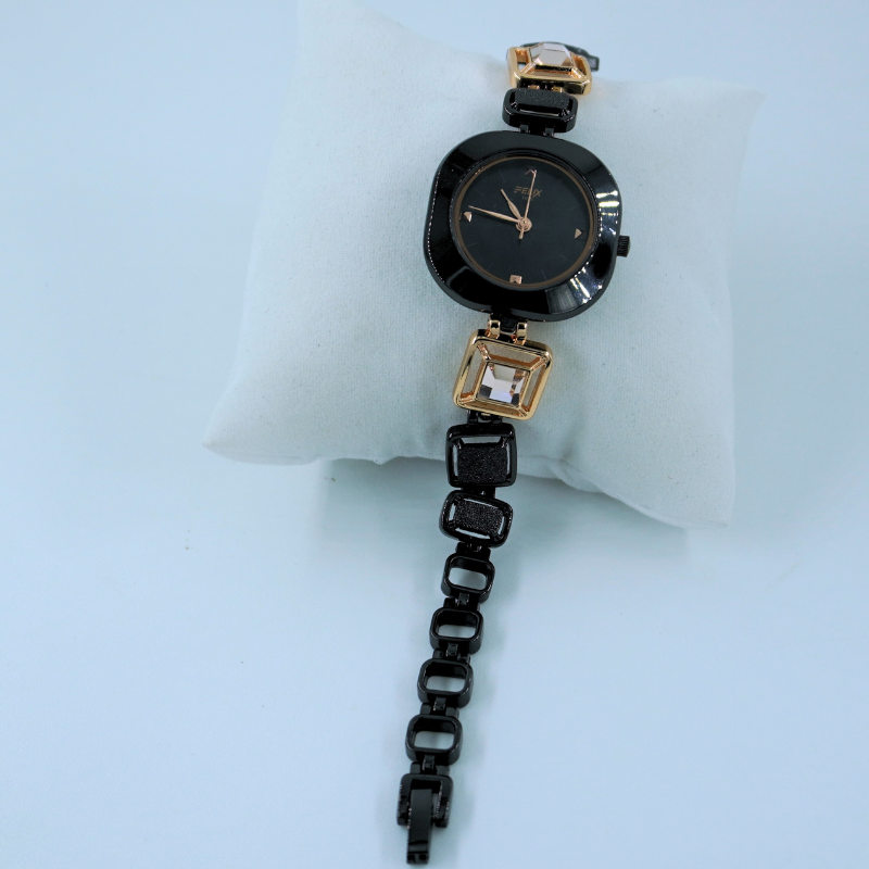 This premium women’s watch showcases a bold black dial paired with elegant crystal-link accents, creating a modern luxury look. Perfect for parties, celebrations, and stylish everyday wear.