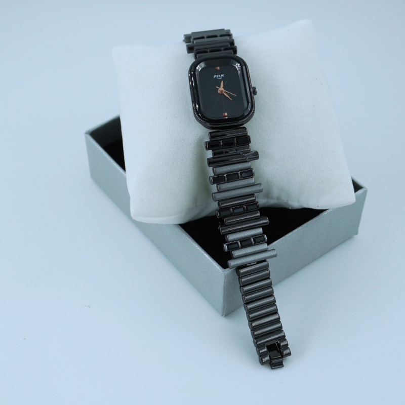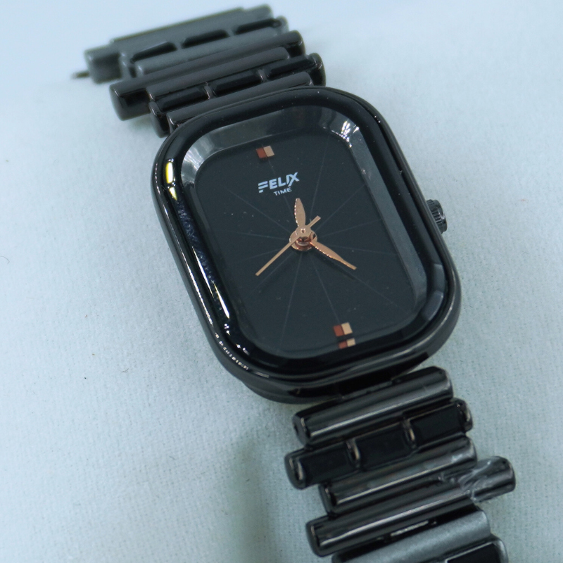 This stunning women’s watch features a glossy black dial paired with a sleek ceramic-style bracelet for a bold, modern look. Its minimalist design with golden accents makes it perfect for parties, office wear, and everyday elegance.