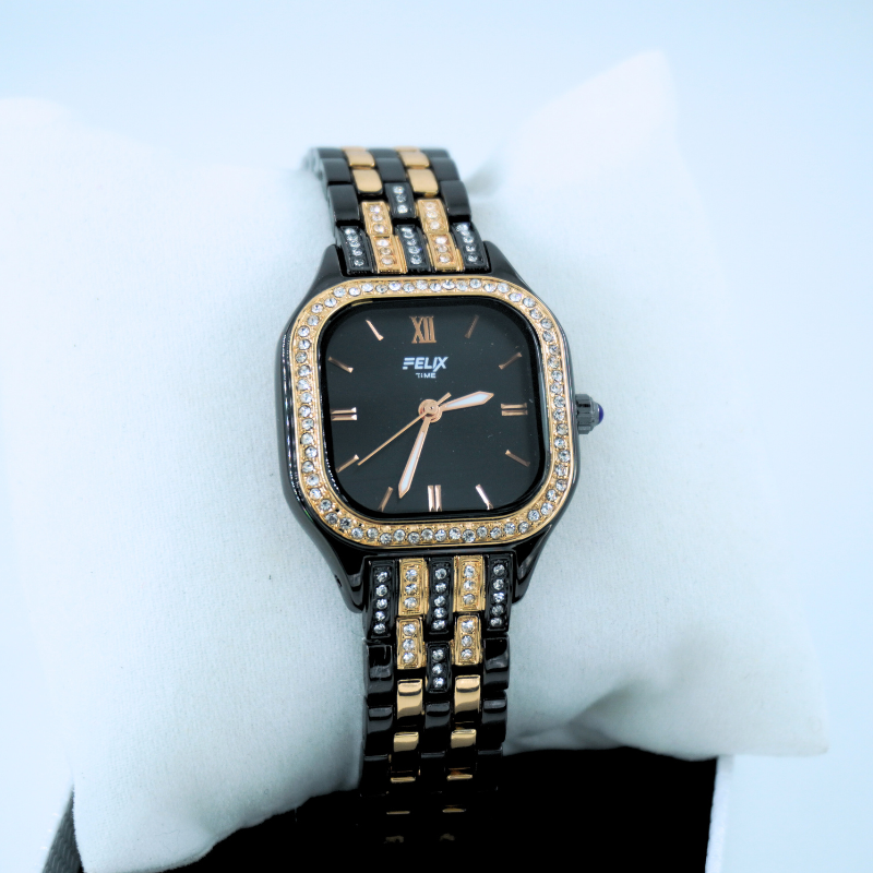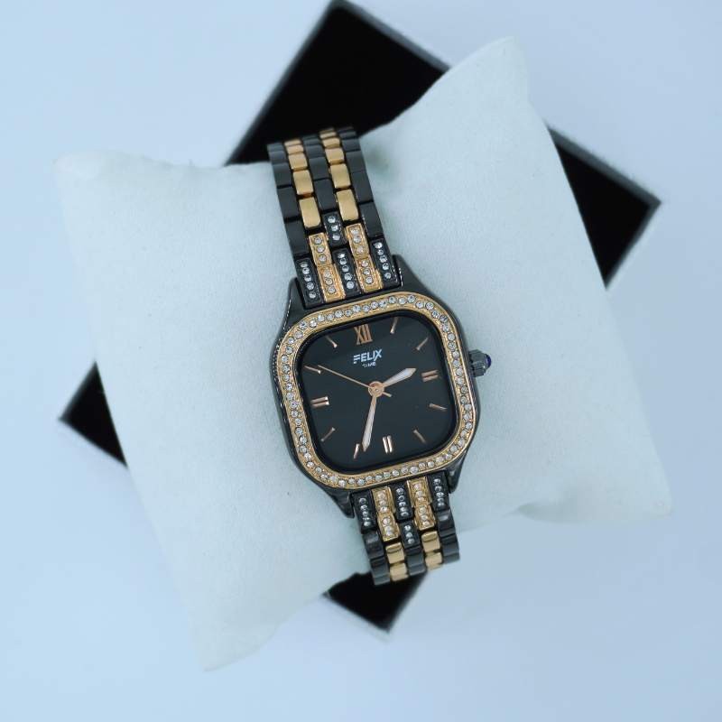 This elegant two-tone women’s watch features a sleek black dial paired with a crystal-studded bracelet for a bold yet luxurious look. Perfect for festive wear, parties, and premium daily styling.