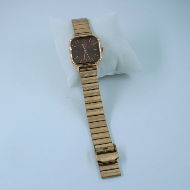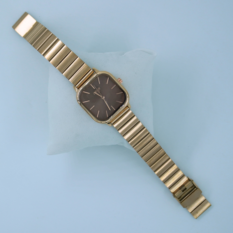 A sleek bronze-toned women’s watch featuring a modern square dial and a smooth metallic strap for a premium statement look. Perfect for office wear, casual outings, and elegant everyday styling.