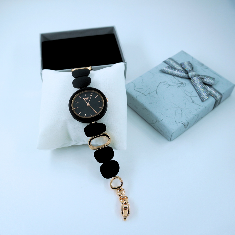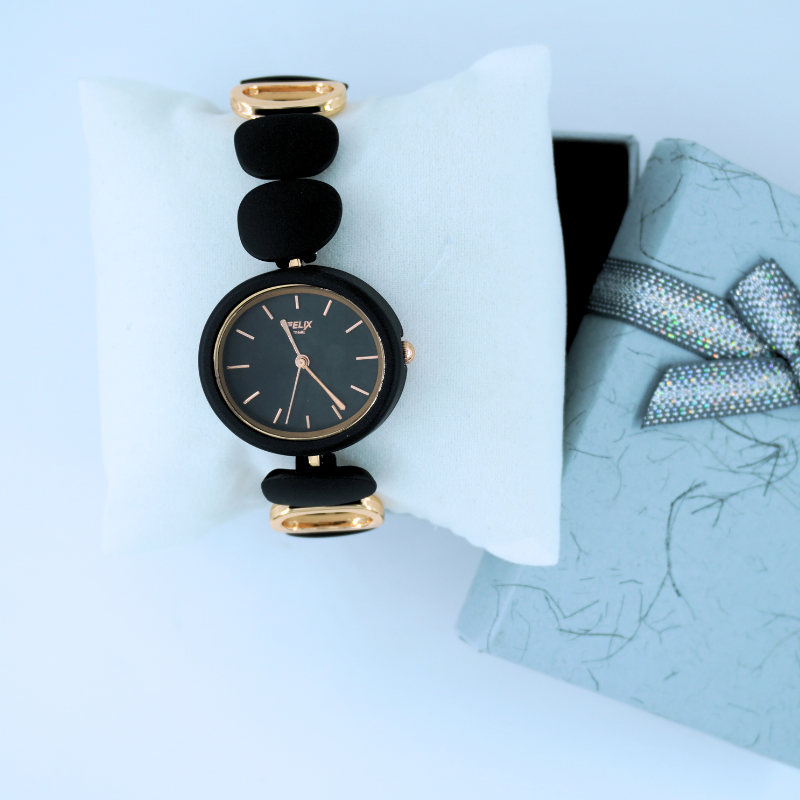 This stylish women’s watch features a sleek black dial paired with unique matte-black and gold designer links, offering a chic modern look. Perfect for both casual and elegant outfits, it adds refined sophistication to everyday wear.