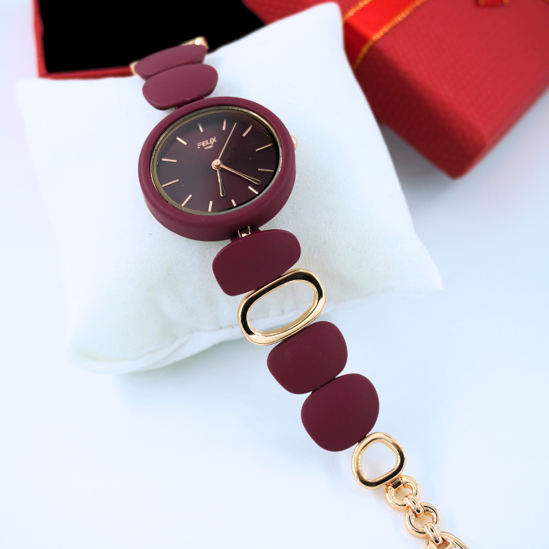 This elegant women’s watch features a deep maroon dial paired with matte maroon links and polished gold accents for a bold, premium look. Perfect for festive wear, daily fashion, and gifting, it adds a touch of luxury to any outfit.