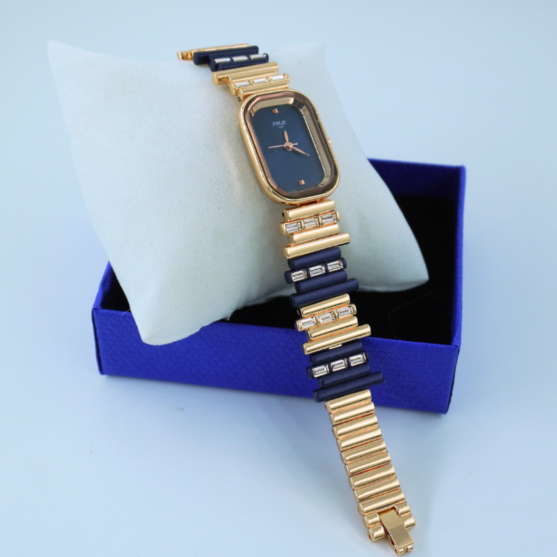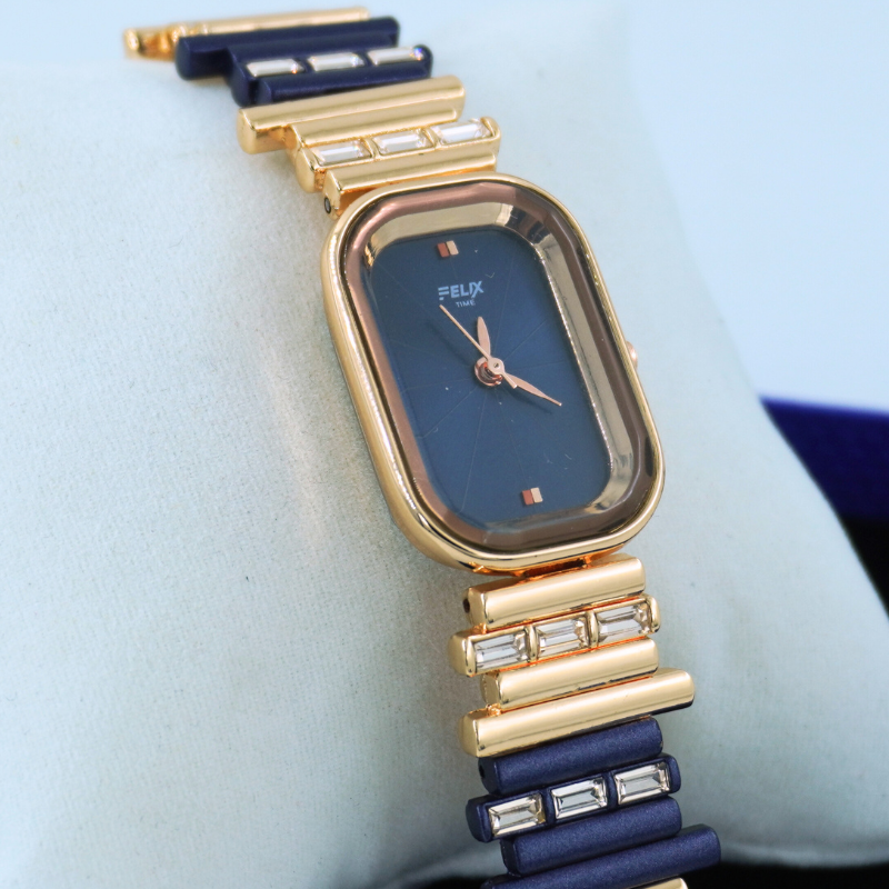 This elegant women’s watch features a deep midnight-blue rectangular dial paired with a premium gold-toned bracelet accented with crystals. A perfect blend of luxury and modern style, ideal for parties, festive looks, and everyday sophistication.