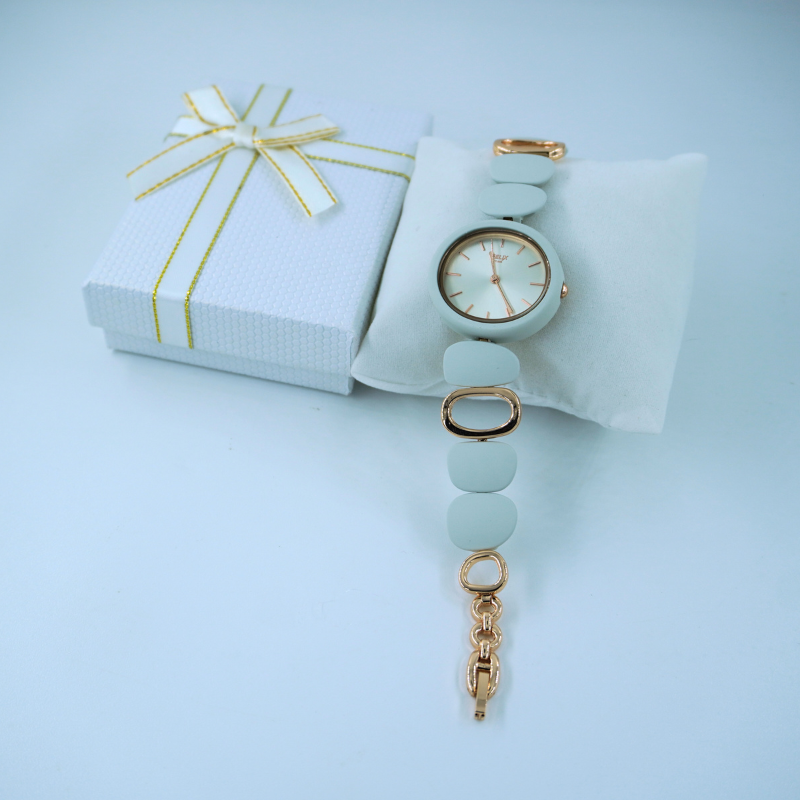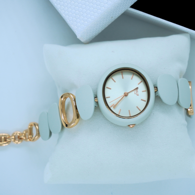 This graceful women’s watch features a soothing mint green dial paired with matte mint links and luxurious gold accents for a soft, premium look. Perfect for daily wear and gifting, it adds a fresh and elegant touch to any outfit.