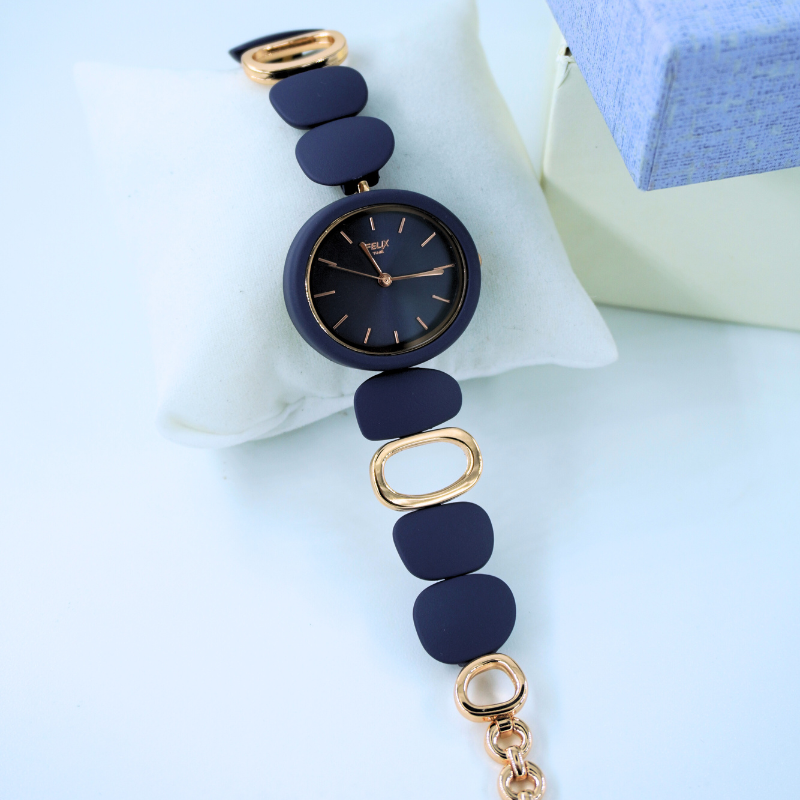 This elegant women’s watch features a refined navy blue dial complemented by matte navy and gold designer links, creating a stylish contemporary look. Perfect for daily wear or special outings, it adds a touch of sophistication to any outfit.