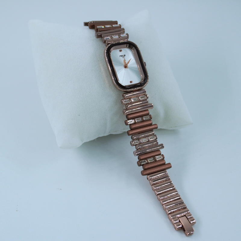 This elegant rose-gold women’s watch features a clean white rectangular dial paired with a crystal-studded bracelet. Designed for premium style, it offers a perfect blend of modern luxury and everyday sophistication.