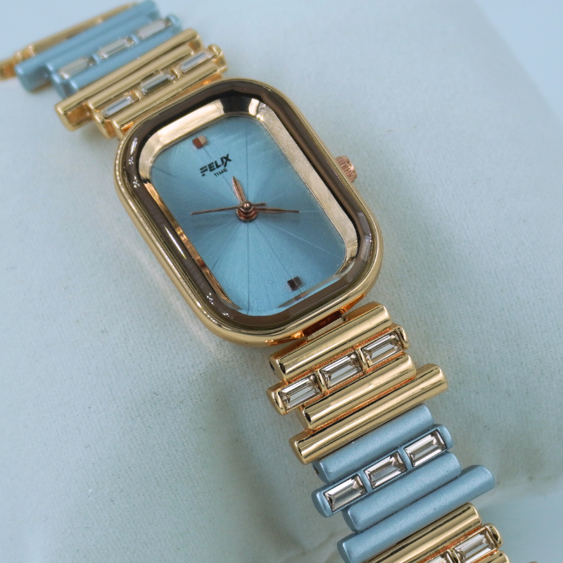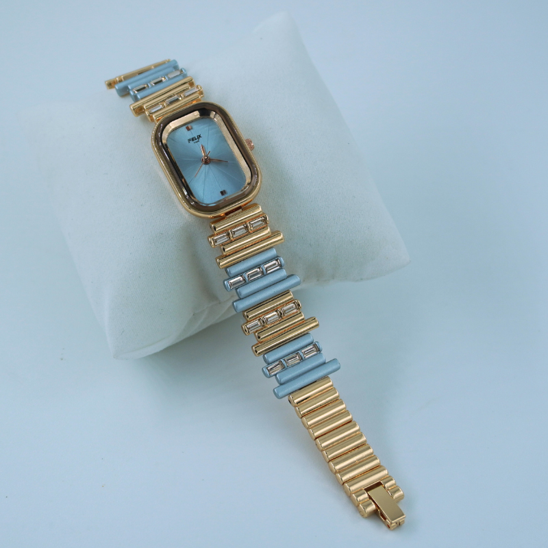 This stylish women’s watch features a soft sky-blue dial paired with a premium dual-tone crystal bracelet. Designed for elegance and everyday glam, it adds a refined sparkle to any outfit.