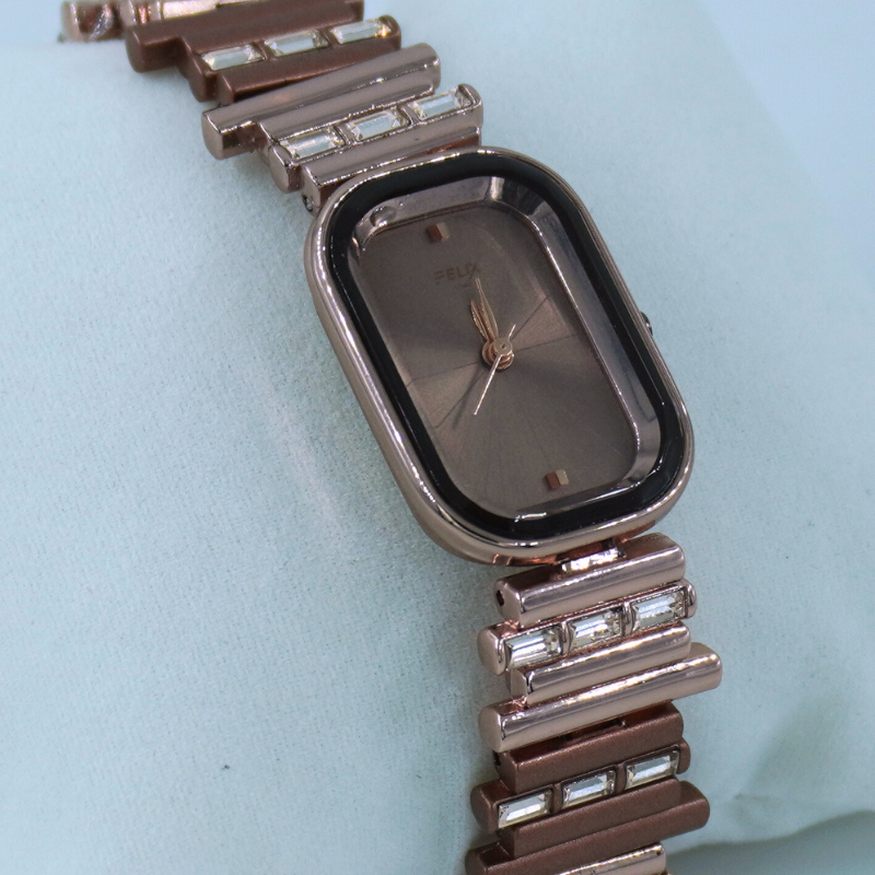 This chic women’s watch features a sleek smoky brown dial paired with a rose-gold crystal-studded bracelet for a premium modern look. Perfect for festive wear, parties, and elegant everyday styling.