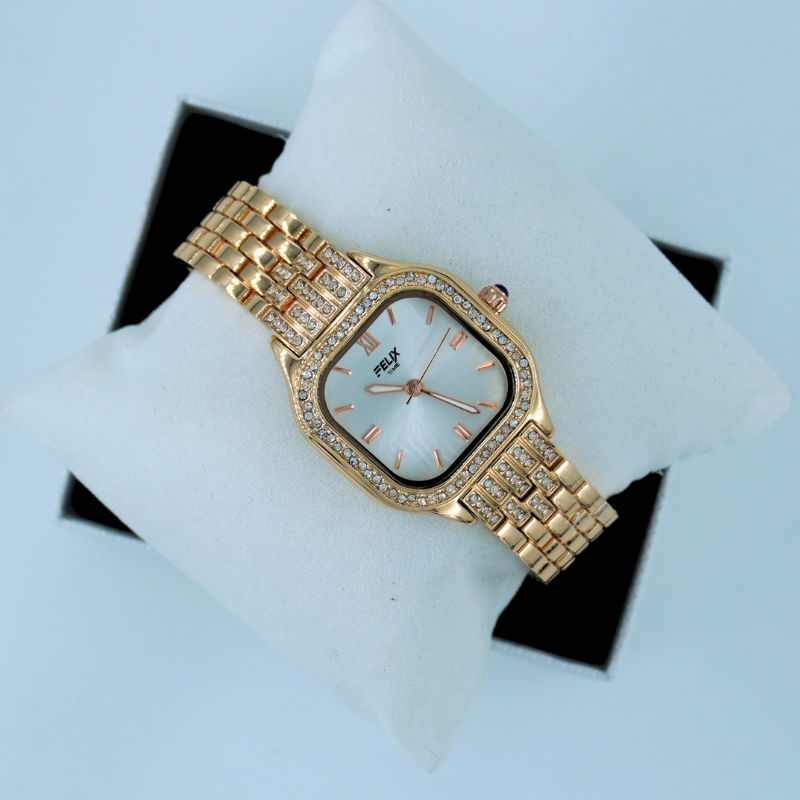 This sophisticated women’s watch features a clean white dial paired with a crystal-embedded gold bracelet for a luxurious and elegant look. Perfect for parties, formal occasions, and everyday glamour, it adds classic beauty to any style.