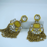 ₹552.50These elegant yellow stone jumka earrings combine antique gold detailing with shimmering kundan drops and long tassel chains. Perfect for festive outfits, weddings, and ethnic celebrations, […]