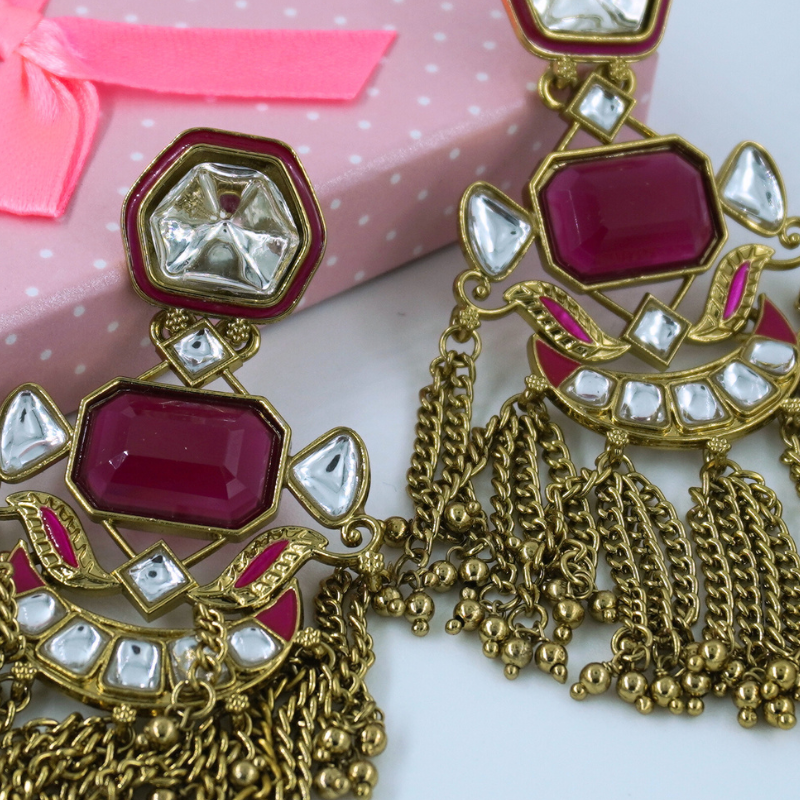 November 24, 2025These statement jumka earrings feature ruby-toned stones, mirror embellishments, and cascading antique-gold chains. Perfect for weddings, festive outfits, and bridal-inspired styling.