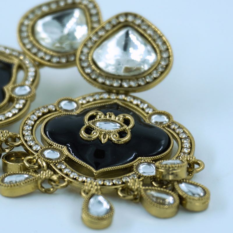 November 24, 2025These stunning earrings feature a bold black enamel base paired with shimmering kundan stones for a rich, traditional look. The intricate gold detailing and tear-drop danglers add elegant movement, perfect for festive and wedding outfits.